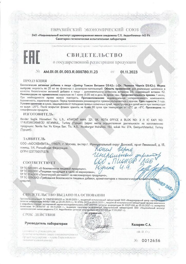 Документы Dr. Thomson Vitamin D3-K2 / Доктор Томсон Витамин D3-K2 жидкость во флаконах по 20 мл с дозатором-капельницей 1 шт