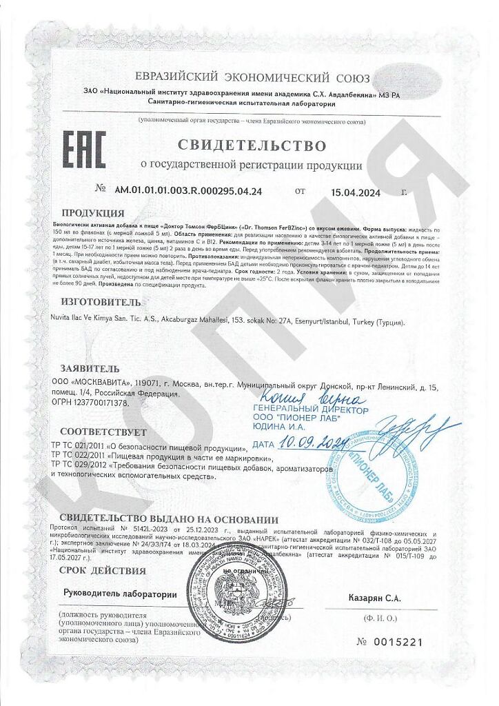 Документы Dr. Thomson FerBZinc / Доктор Томсон ФерБЦинк со вкусом ежевики жидкость во флаконах по 150 мл 1 шт