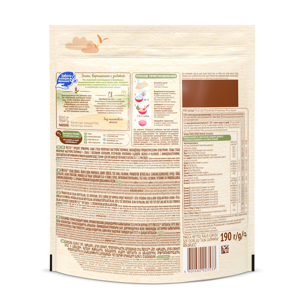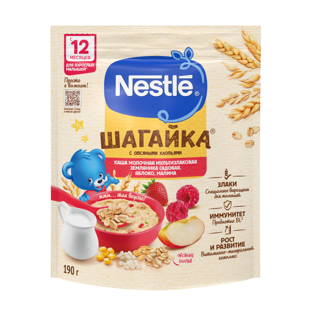 Nestle Шагайка каша молочная мультизлаковая с овсяными хлопьями, малиной, яблоком и кусочками земляники садовой с 12 мес пакет 190 г 1 шт: отзывы покупателей и фармацевтов