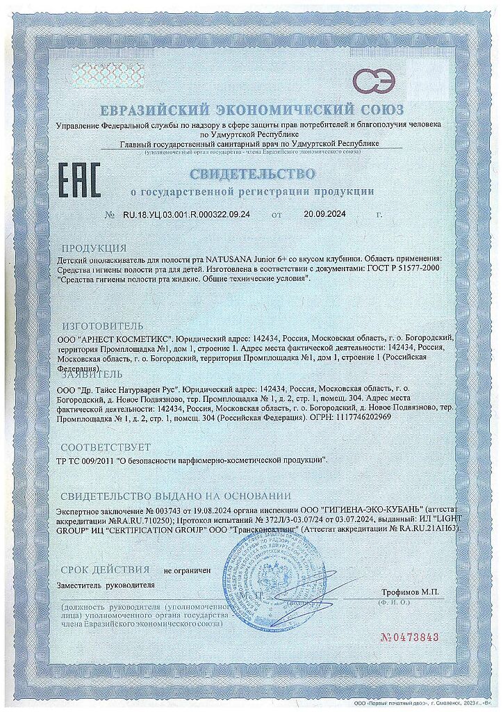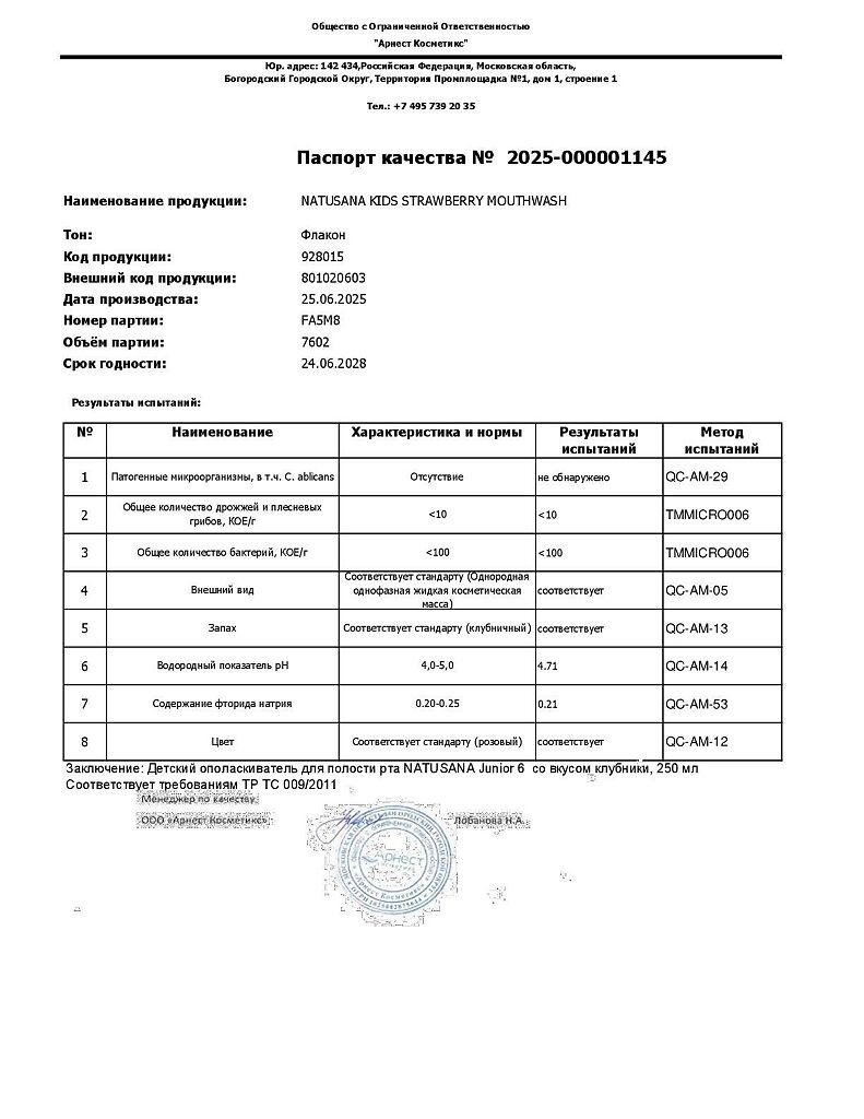 Документы Natusana Junior Ополаскиватель для полости рта со вкусом клубники детский 6+ 250 мл 1 шт