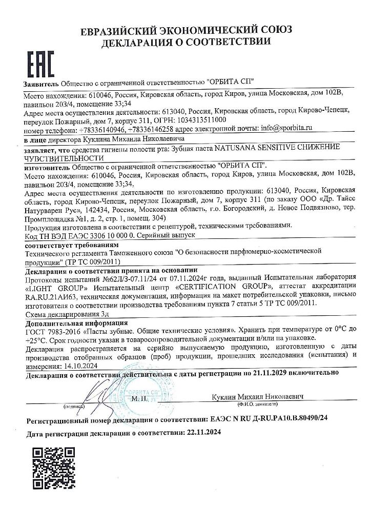Документы Natusana Зубная паста Sensitive снижение чувствительности 100 мл 1 шт