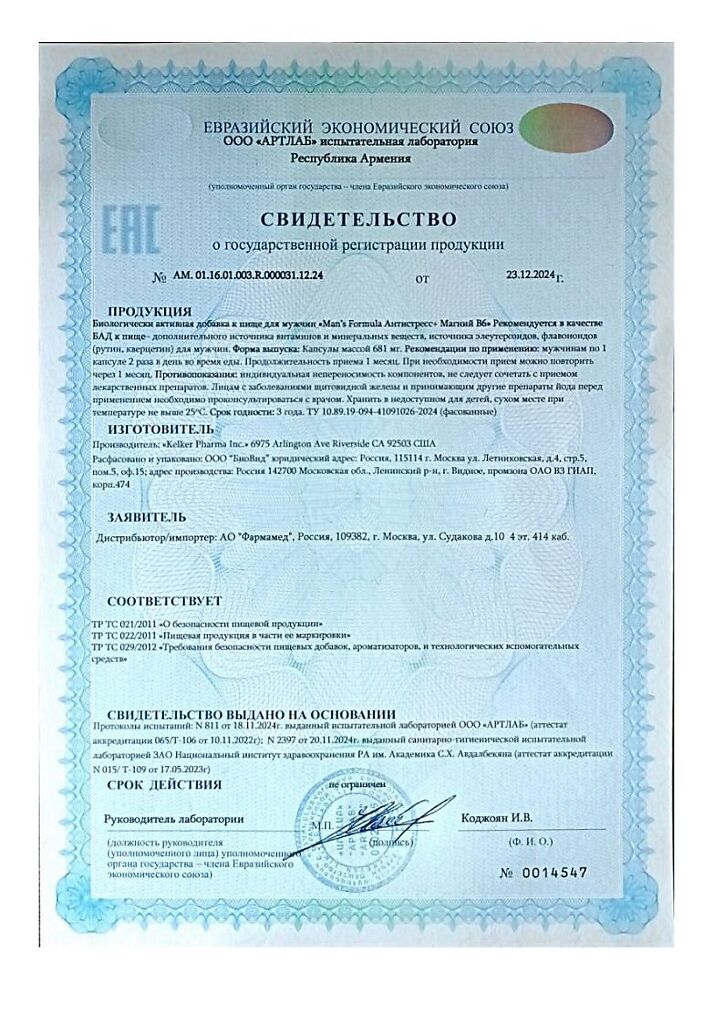 Документы Man's formula / Менс формула Антистресс+Магний B6 капсулы массой 681 мг 30 шт