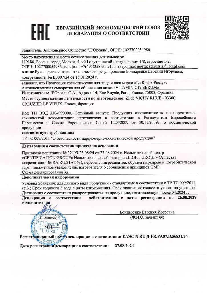 Документы La Roche-Posay Vitamin C12 сыворотка антиоксидантная для обновления кожи лица 30 мл 1 шт