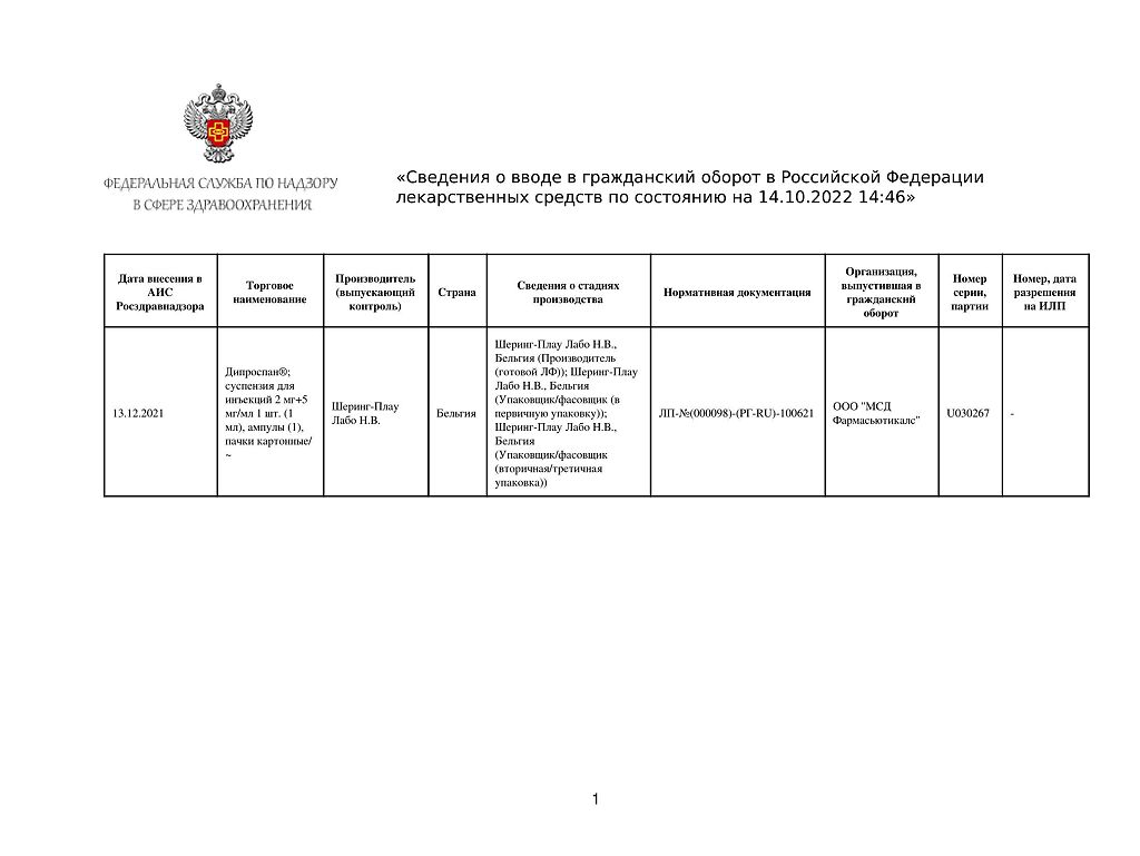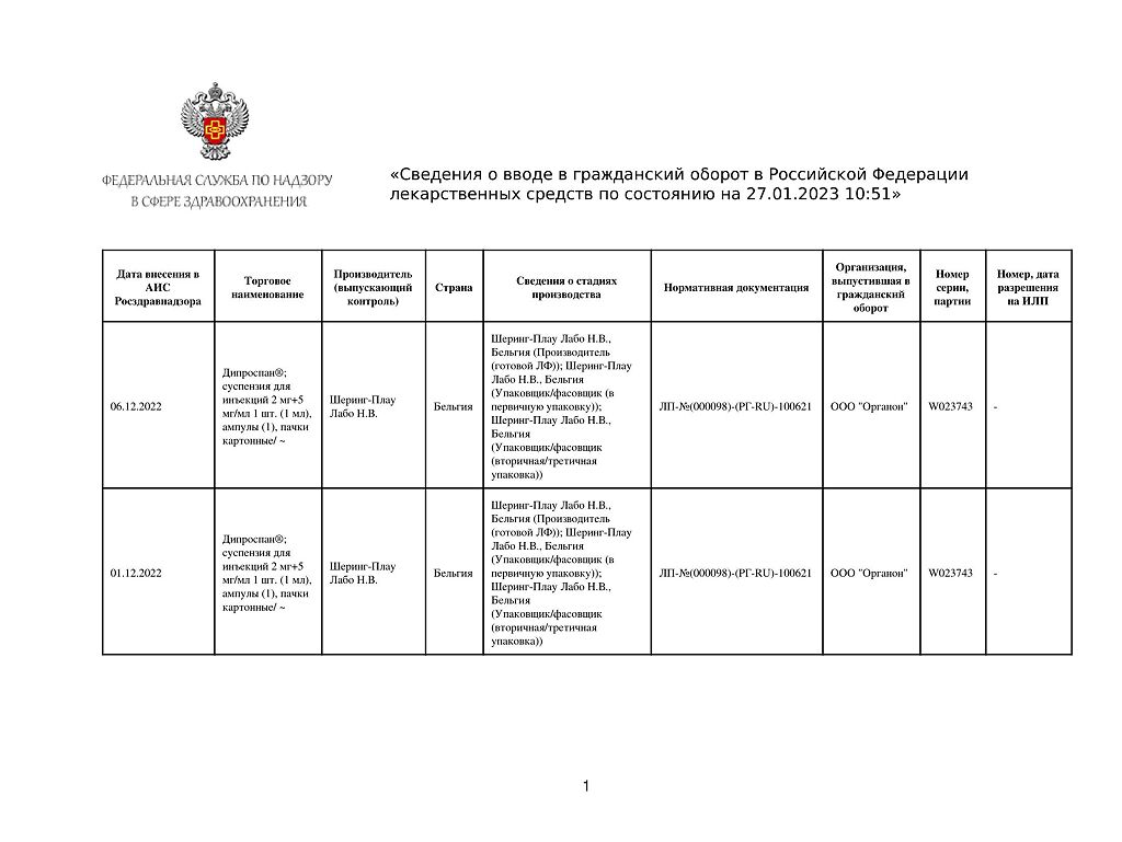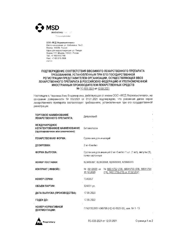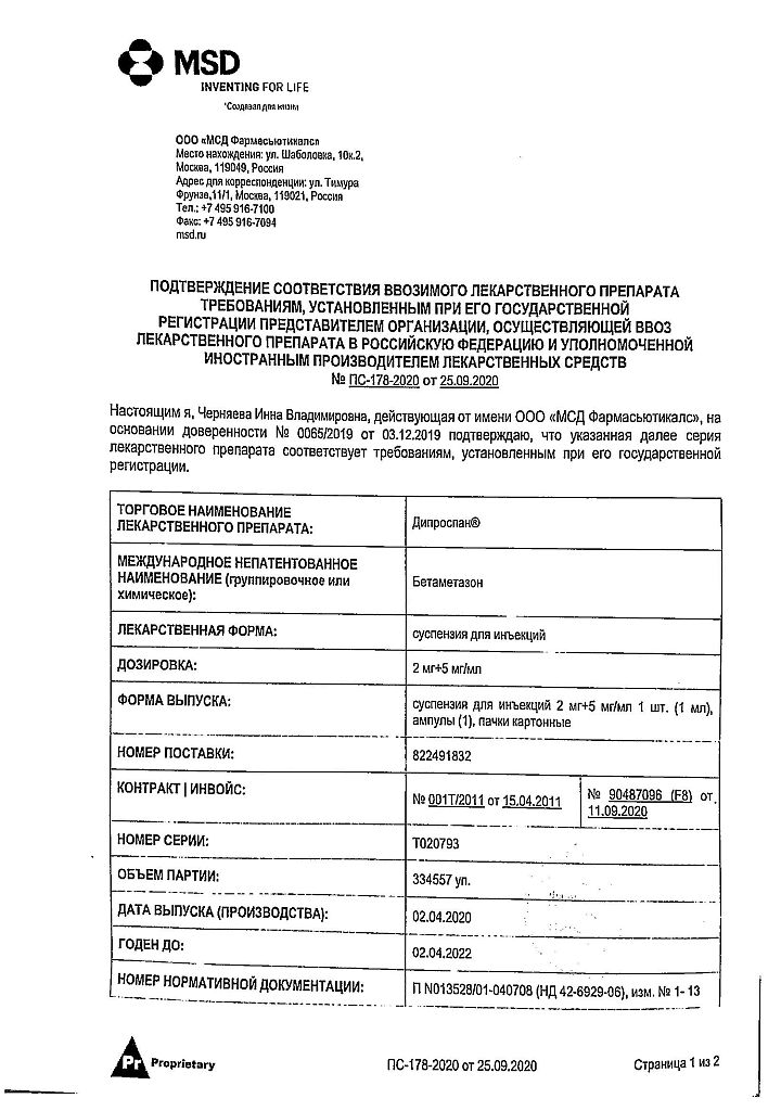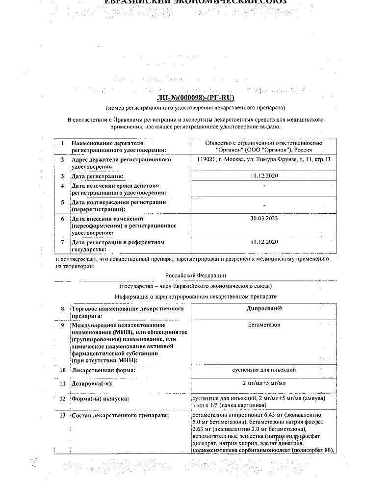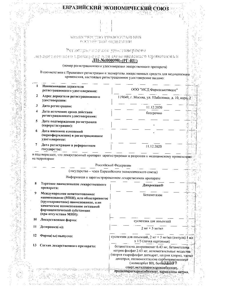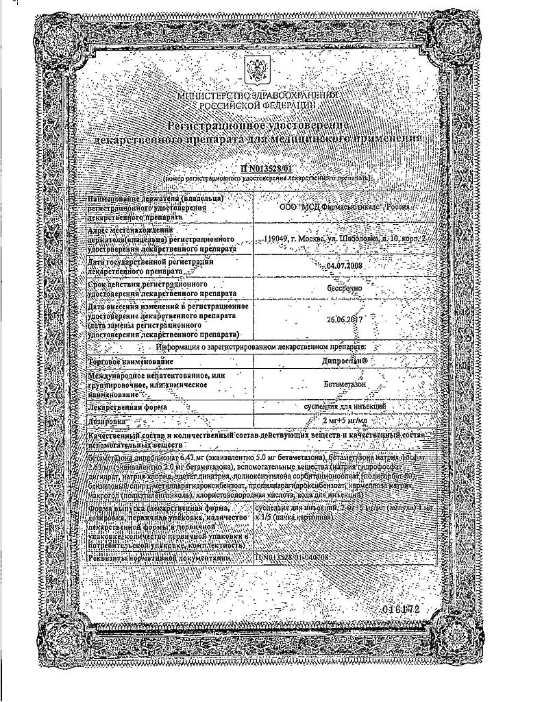 Документы Дипроспан суспензия для инъекций 2 мг+5 мг/мл 1 мл 1 шт