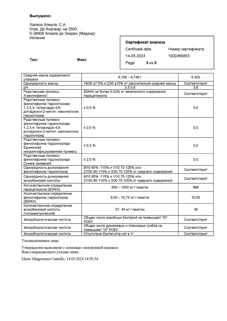 Действующее вещество: Парацетамол, Фенилэфрин, [Аскорбиновая кислота]