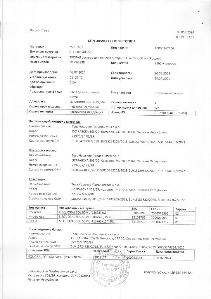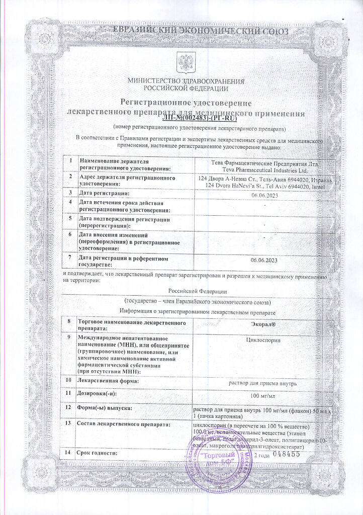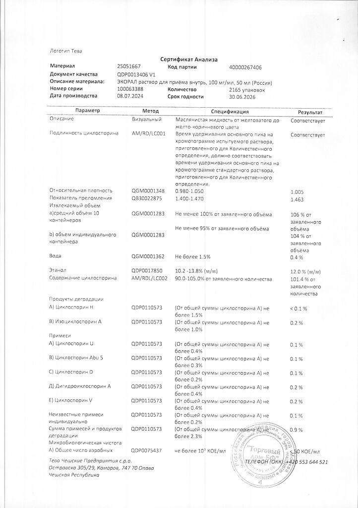 Документы Экорал раствор для приема внутрь 100 мг/мл 50 мл 1 шт