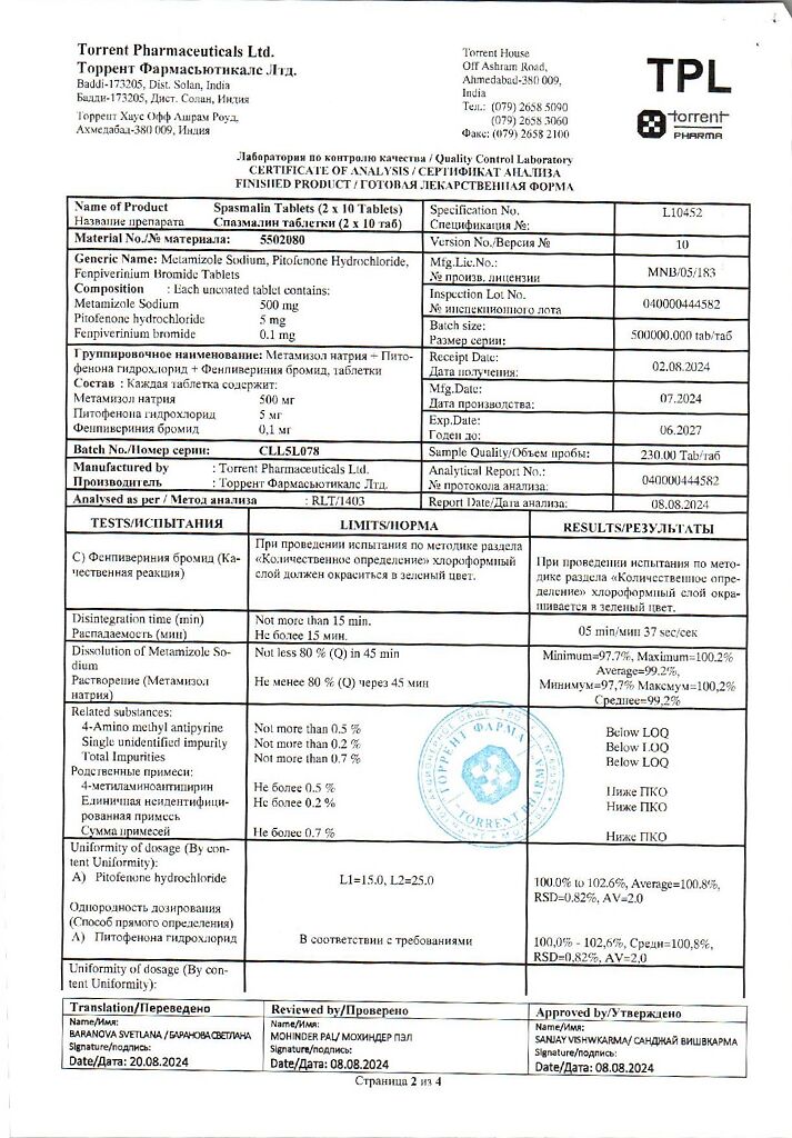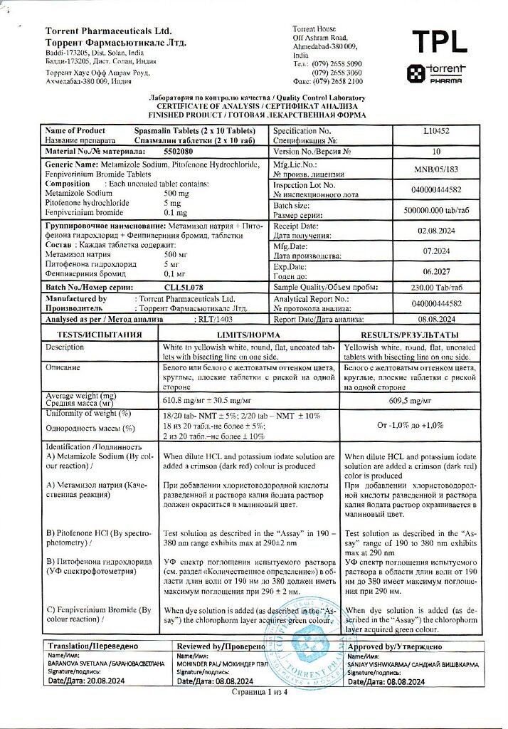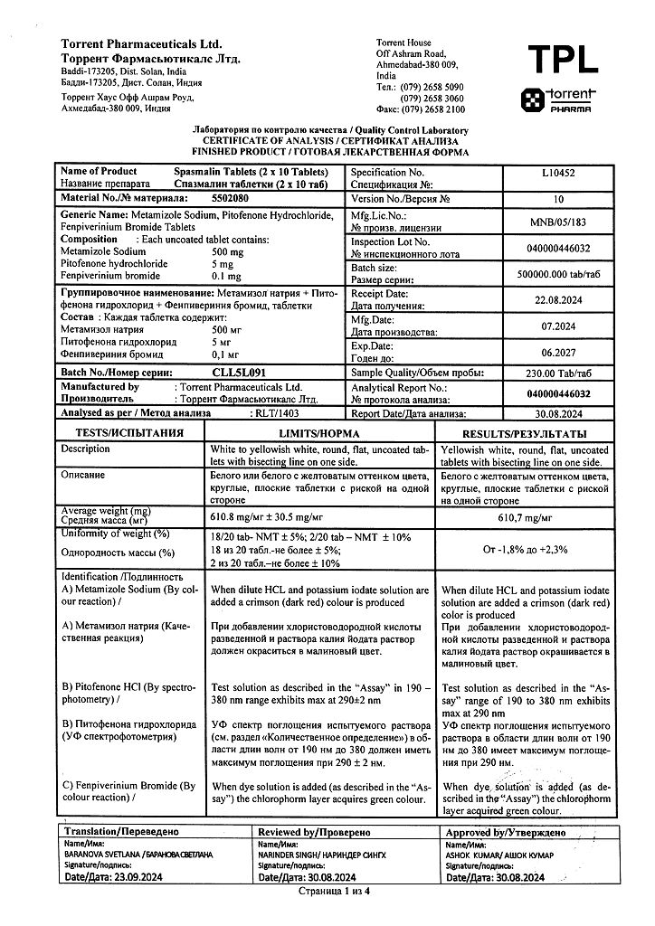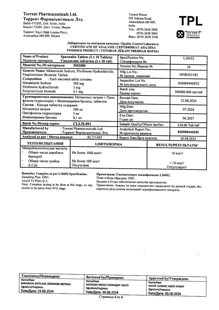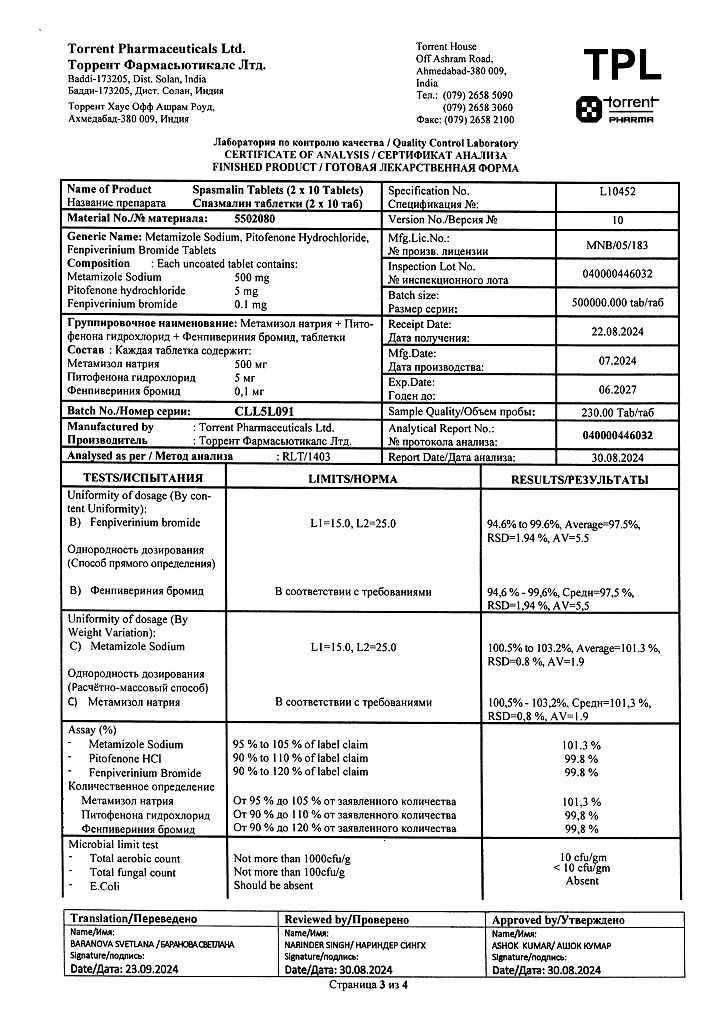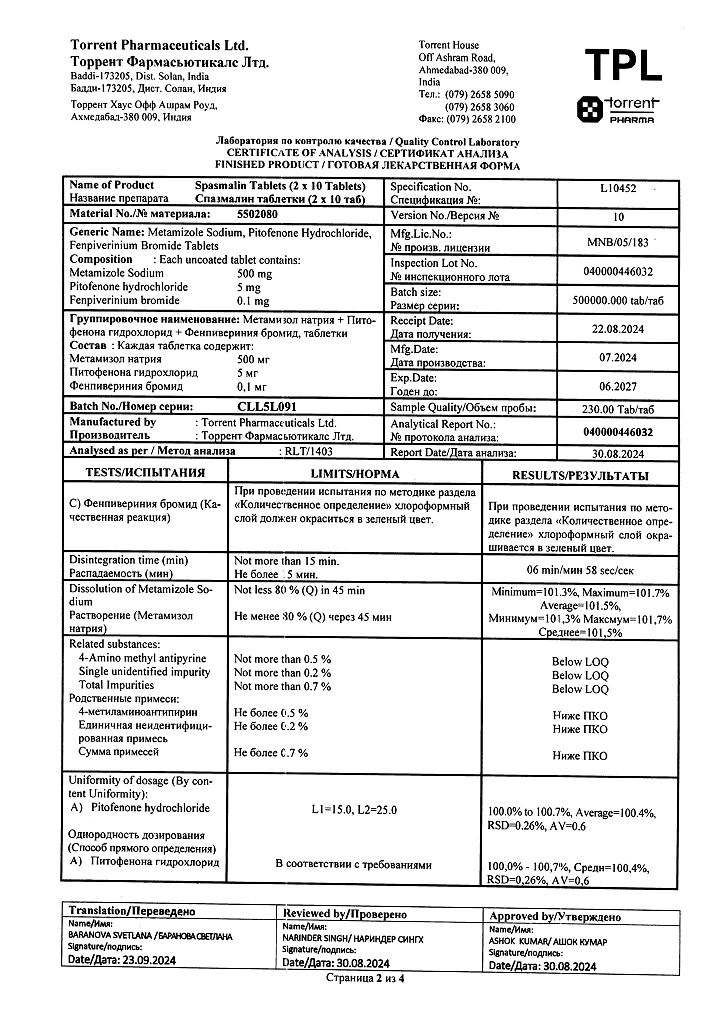 Действующее вещество: Метамизол натрия, Питофенон, Фенпивериния бромид