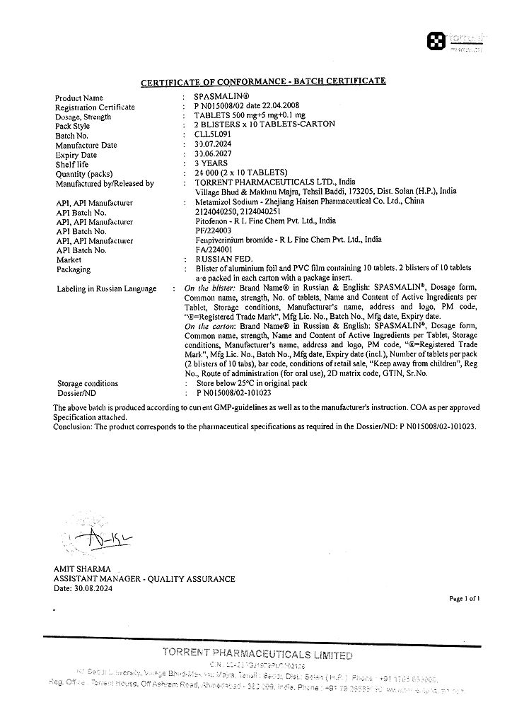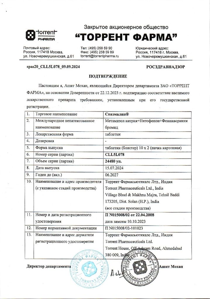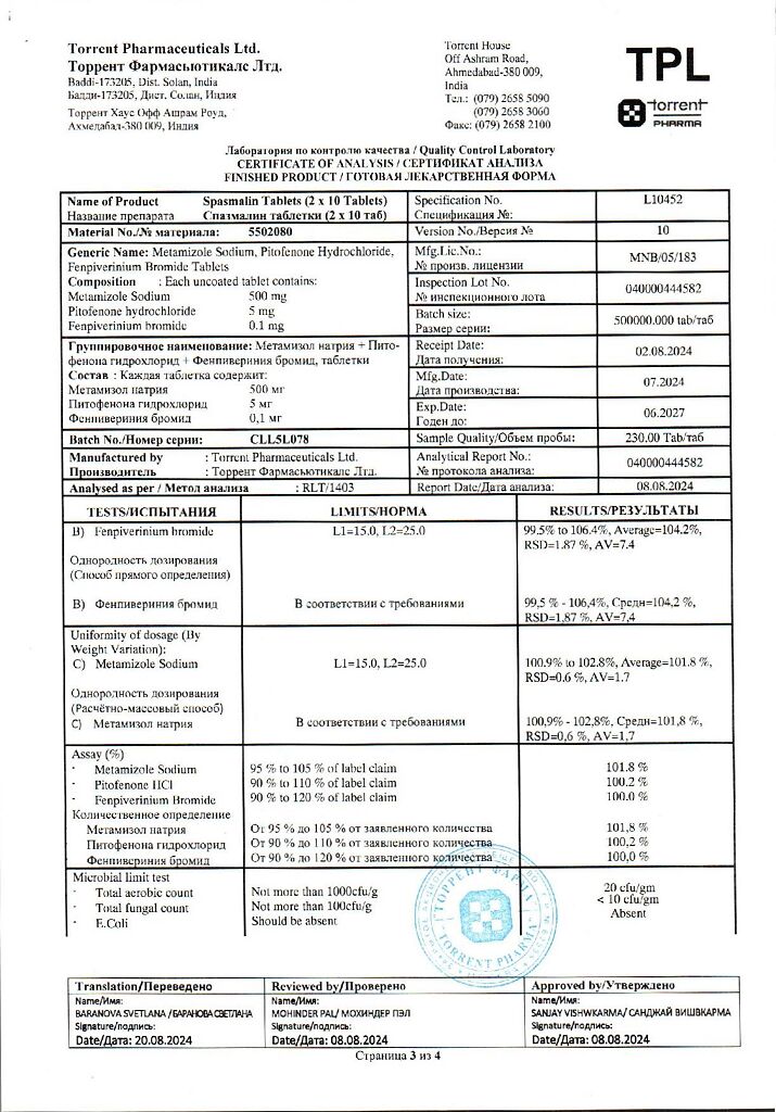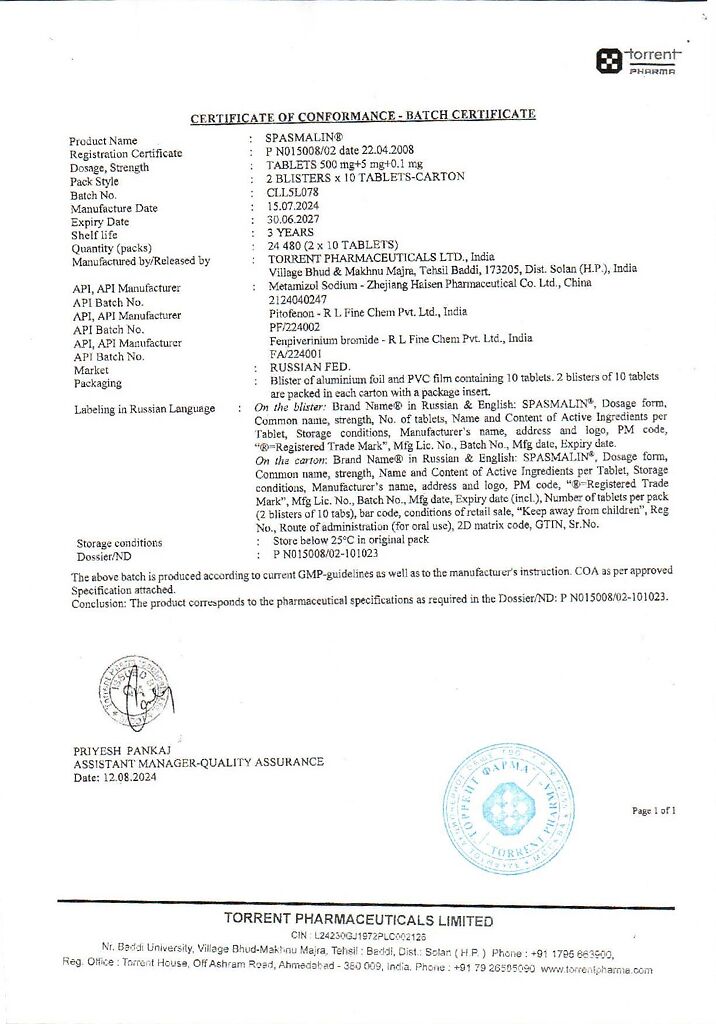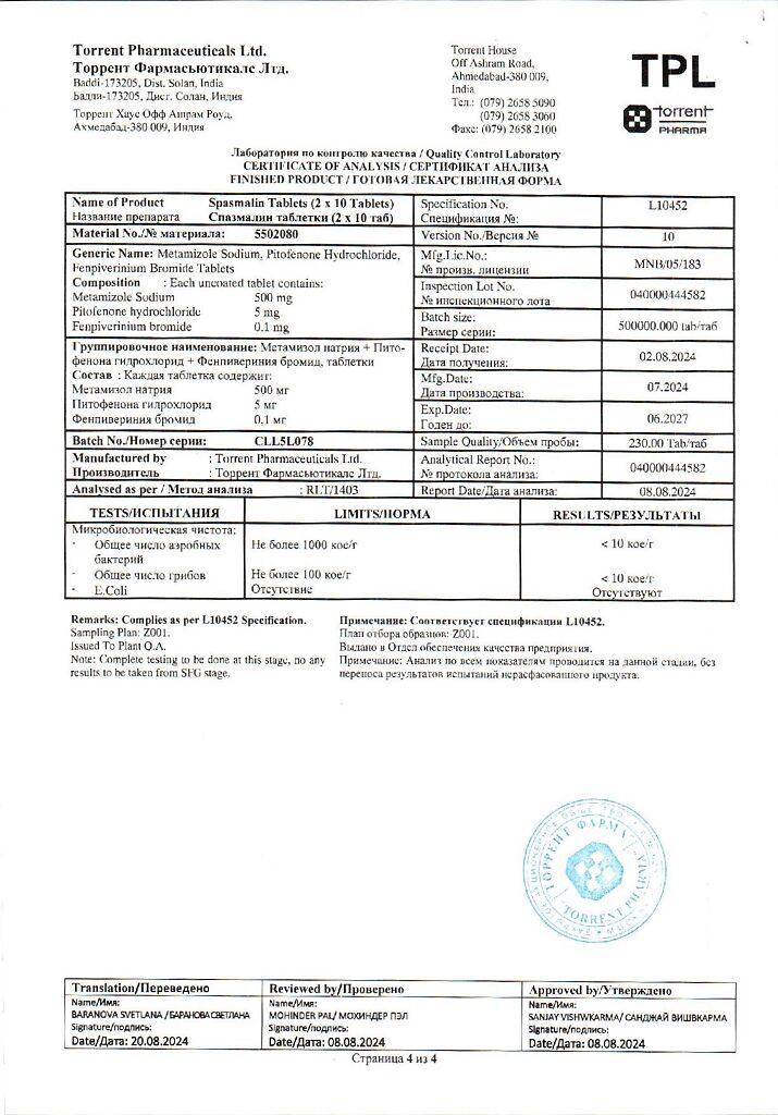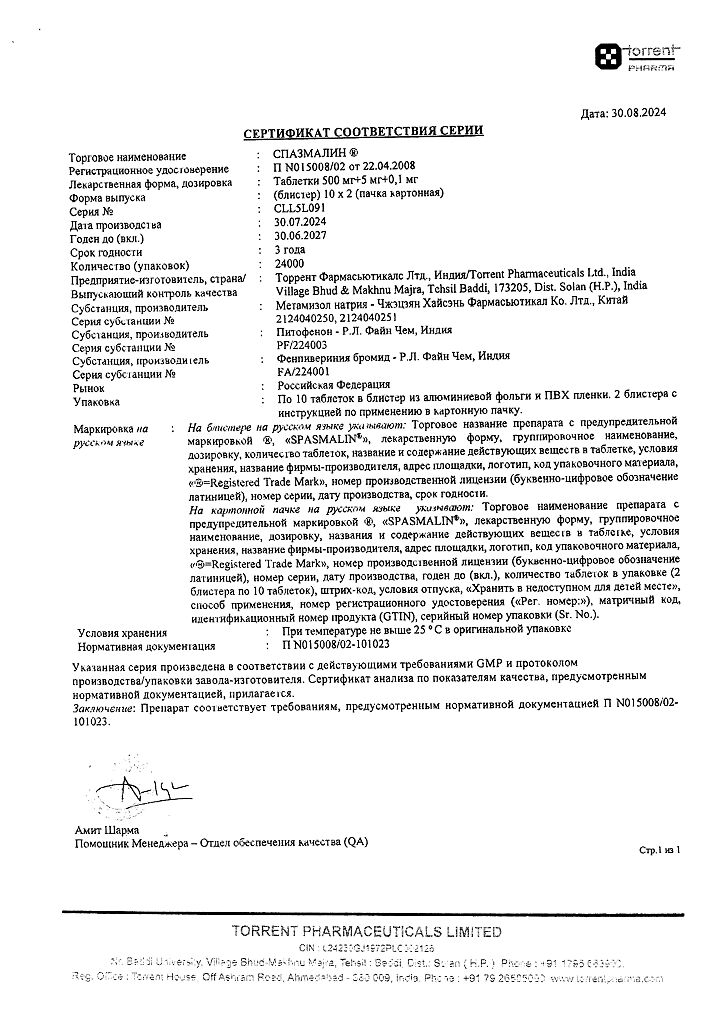 Действующее вещество: Метамизол натрия, Питофенон, Фенпивериния бромид
