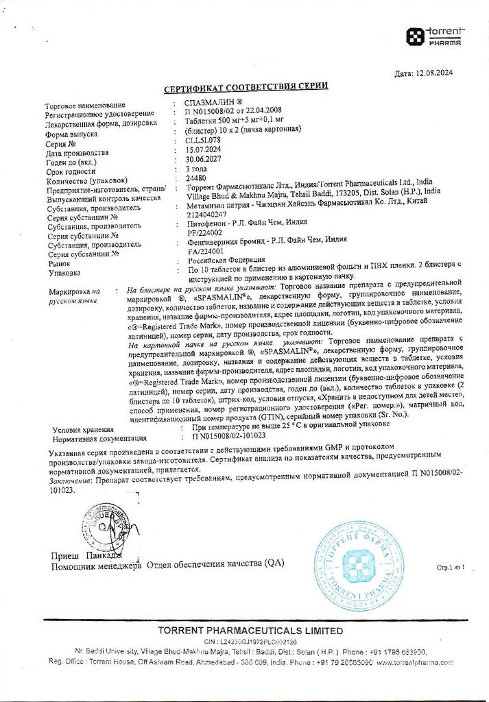 Производитель: Торрент Фармасьютикалс Лтд, Индия