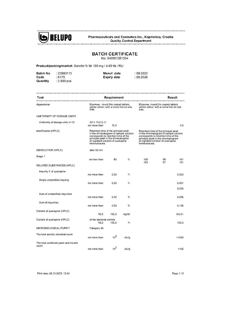 Действующее вещество: Кветиапин