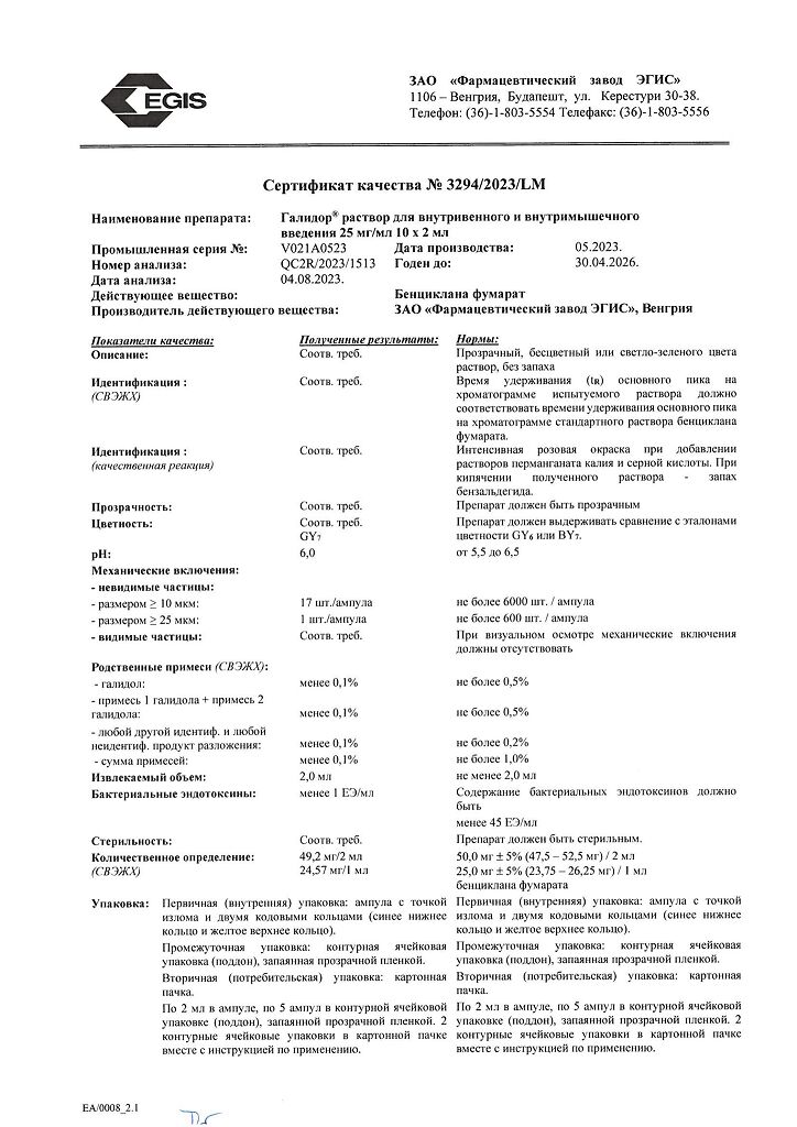 Документы Галидор раствор для в/в и в/м введ. 25 мг/мл 2 мл 10 шт