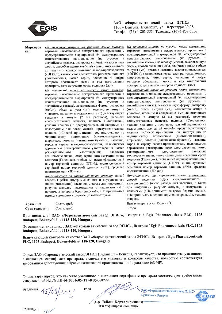 В острых случаях вводят в вену медленно 2-4 ампулы (4-8 мл) препарата, разведенного солевым раствором до 10 - 20 мл или глубоко внутримышечно 2 мл.
