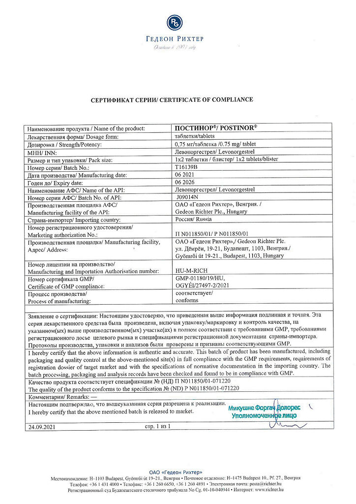 Производитель: Гедеон Рихтер, Венгрия