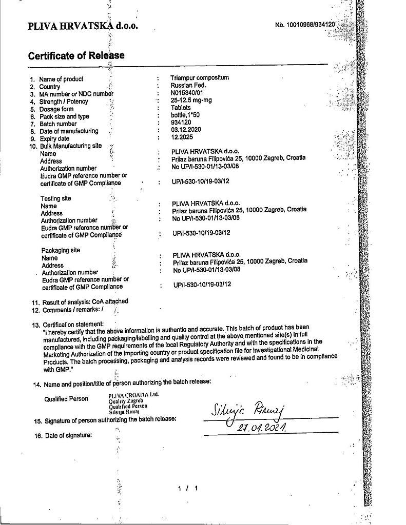 Производитель: Плива Хрватска д.о.о., Хорватия