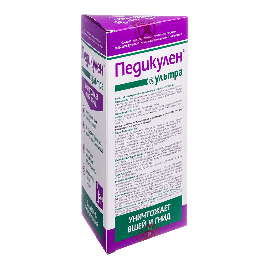 Педикулицидный шампунь «Педикулен Ультра» предназначено для уничтожения головных вшей и их личинок у взрослых людей и детей с 3 лет. Средство педикулицидное обладает острым действием в отношении головных вшей и обеспечивает 100% гибель насекомых.