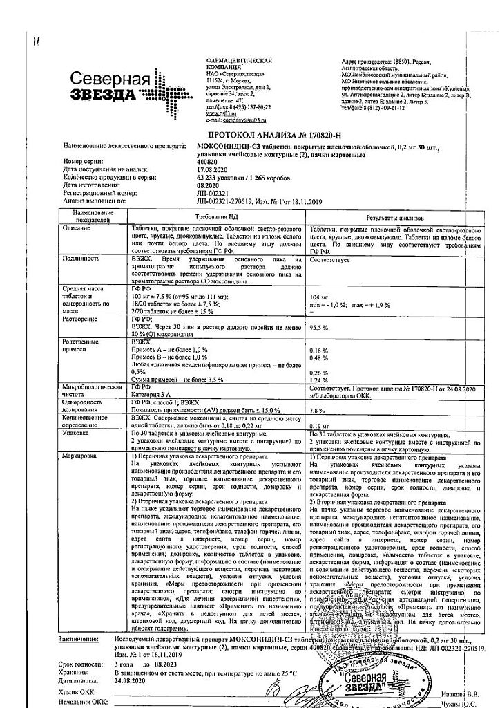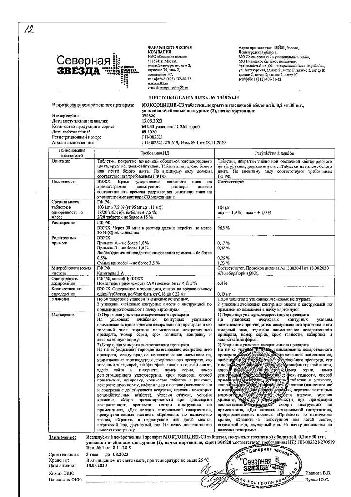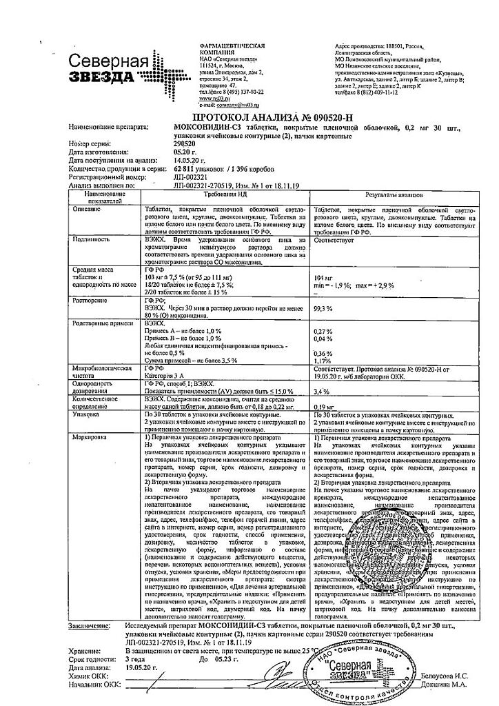 Лечение: специфический антидот препарата не существует. В случае выраженного снижения АД может потребоваться восстановление ОЦК за счет введения жидкости и допамина (инъекционно). Брадикардия может быть купирована атропином (инъекционно). В тяжелых случаях передозировки рекомендуется тщательно контролировать нарушение сознания и не допускать угнетение дыхания. Антагонисты альфа-адренорецепторов могут уменьшать или устранять парадоксальные гипертензивные эффекты при передозировке моксонидина. Моксонидин в незначительной степени выводится при проведении гемодиализа.