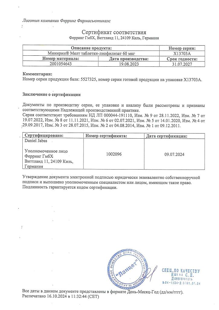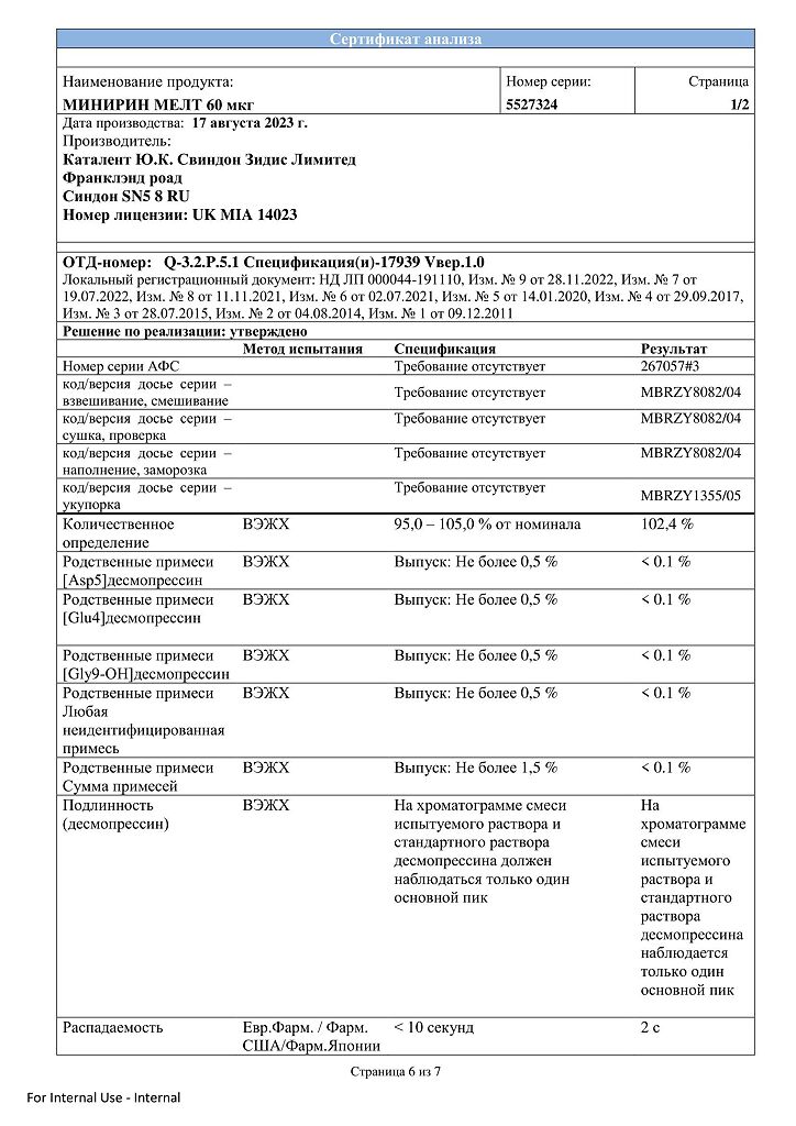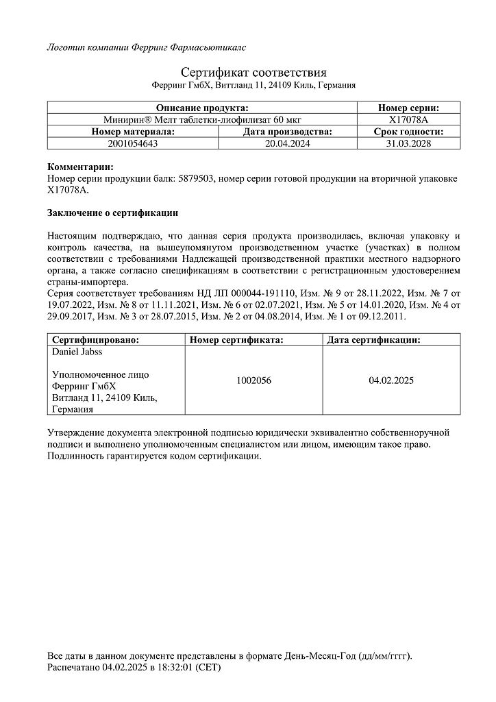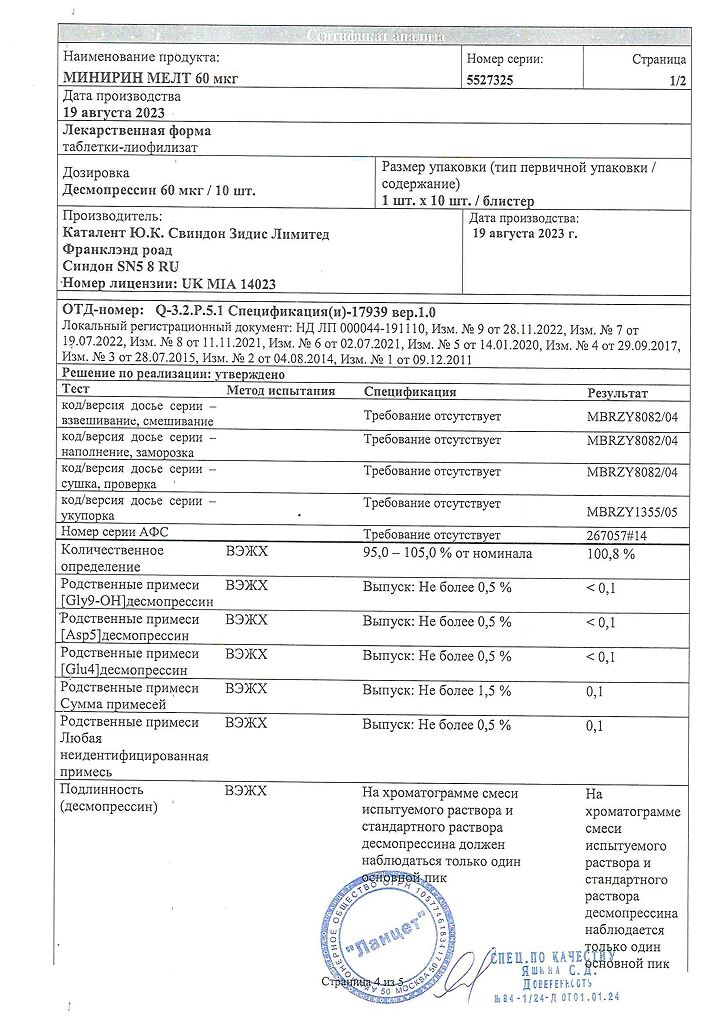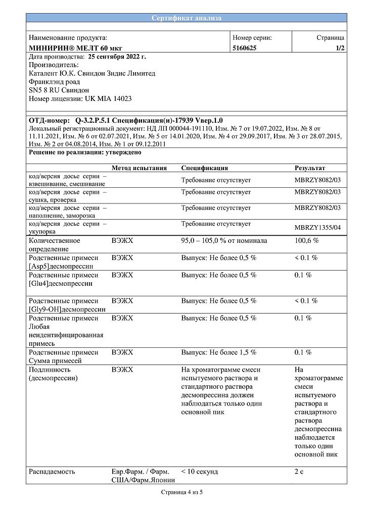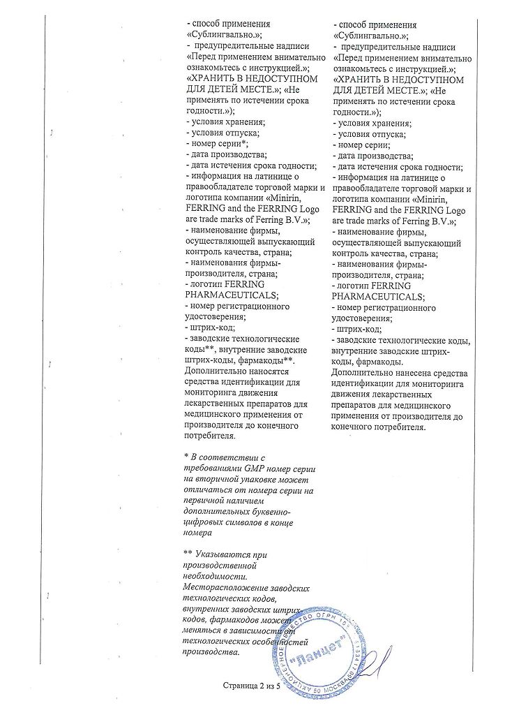 Документы Минирин Мелт таблетки-лиофилизат 60 мкг 30 шт