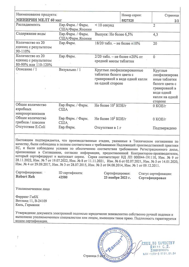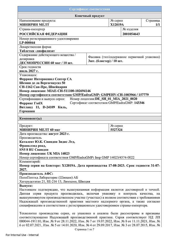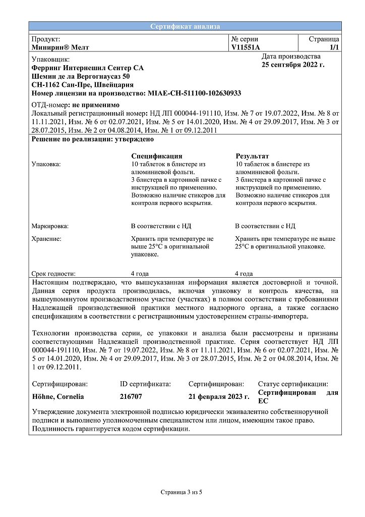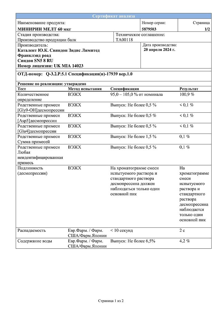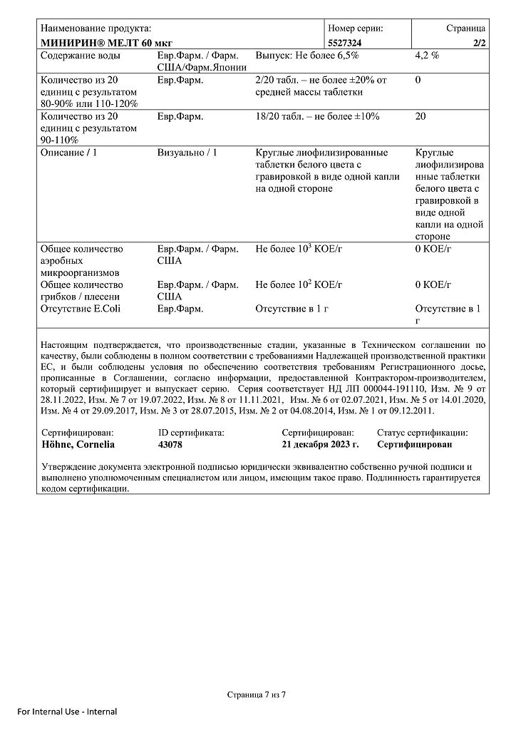 Документы Минирин Мелт таблетки-лиофилизат 60 мкг 30 шт