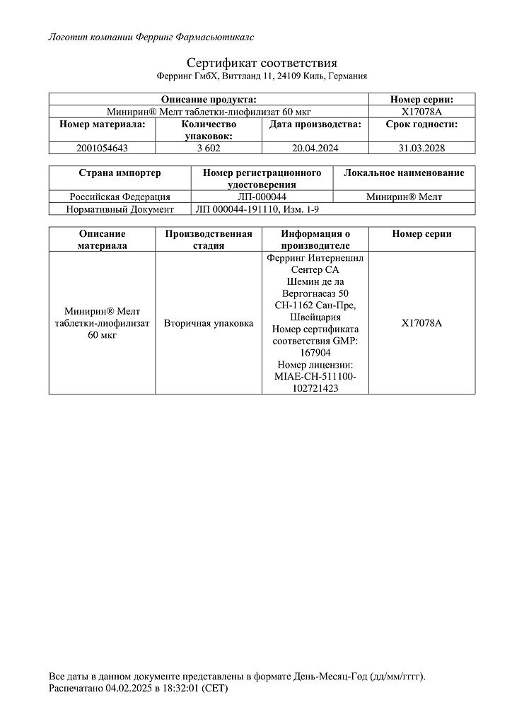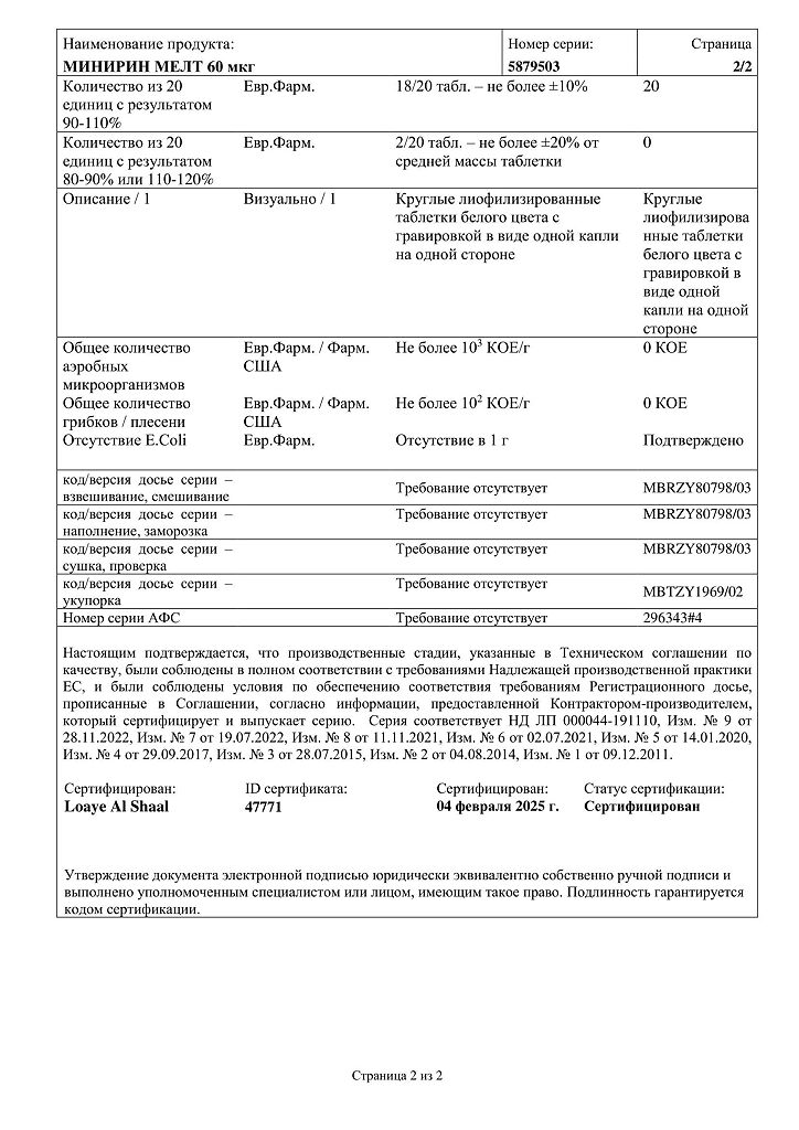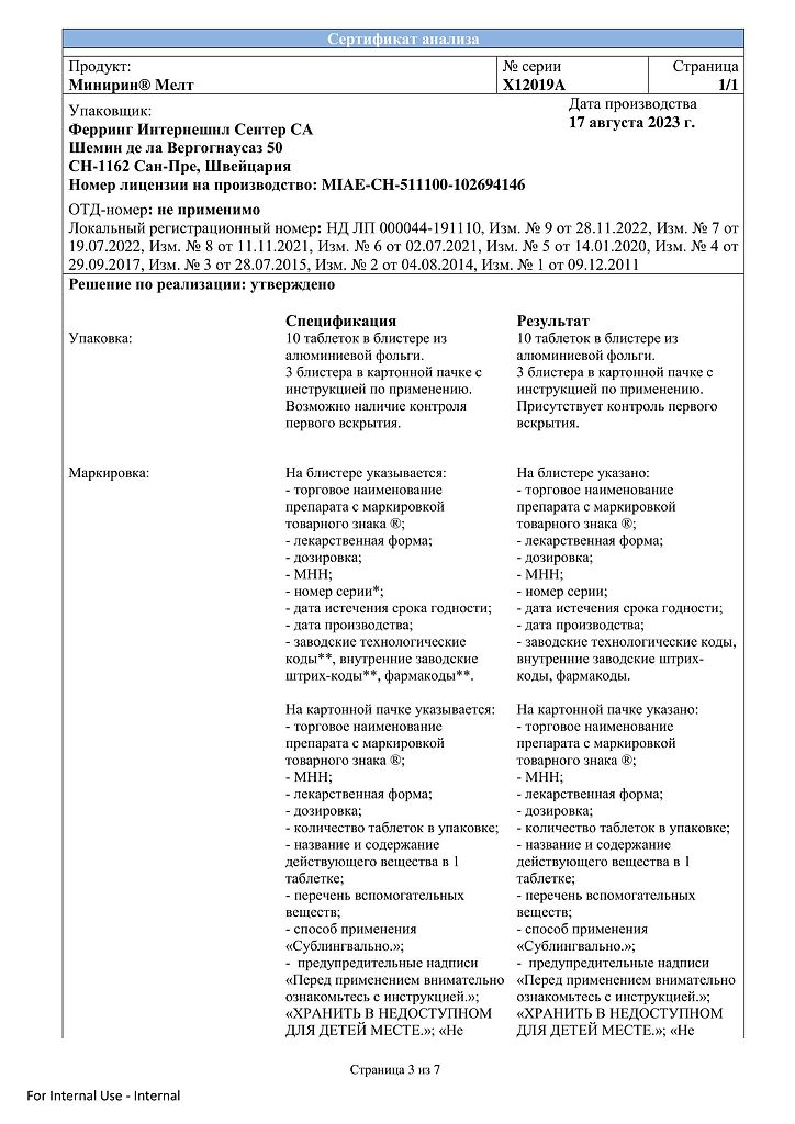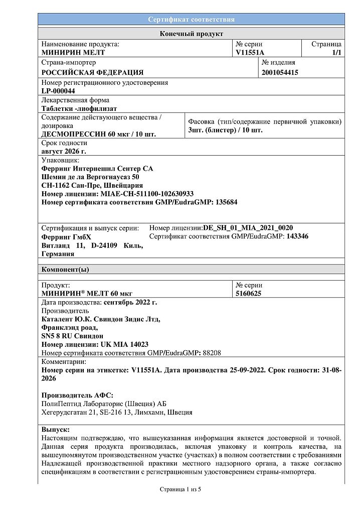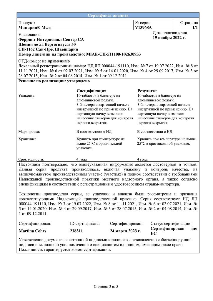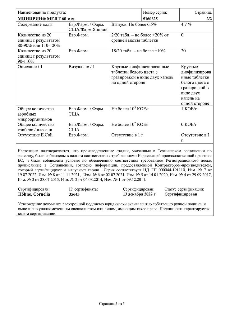 Документы Минирин Мелт таблетки-лиофилизат 60 мкг 30 шт