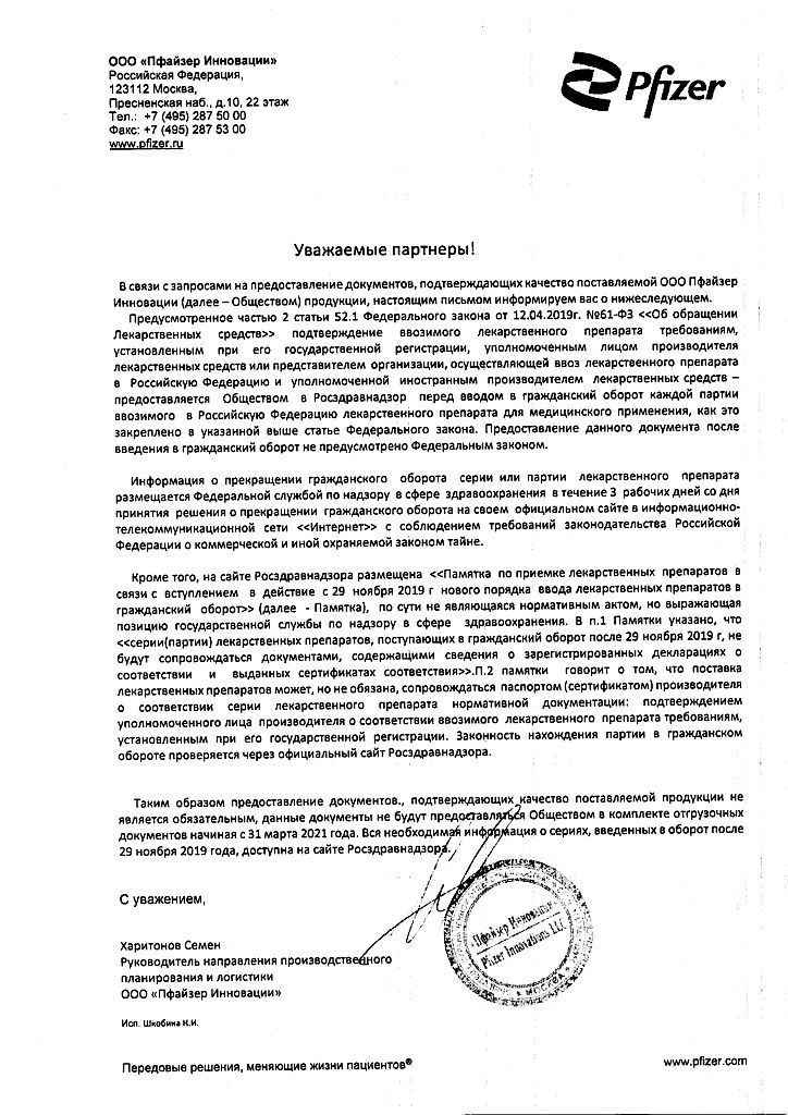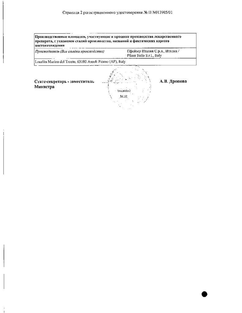 Производитель: Пфайзер Италия С.р.Л., Италия