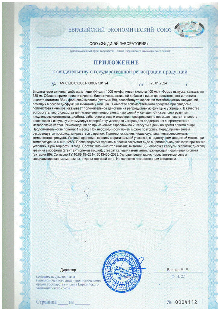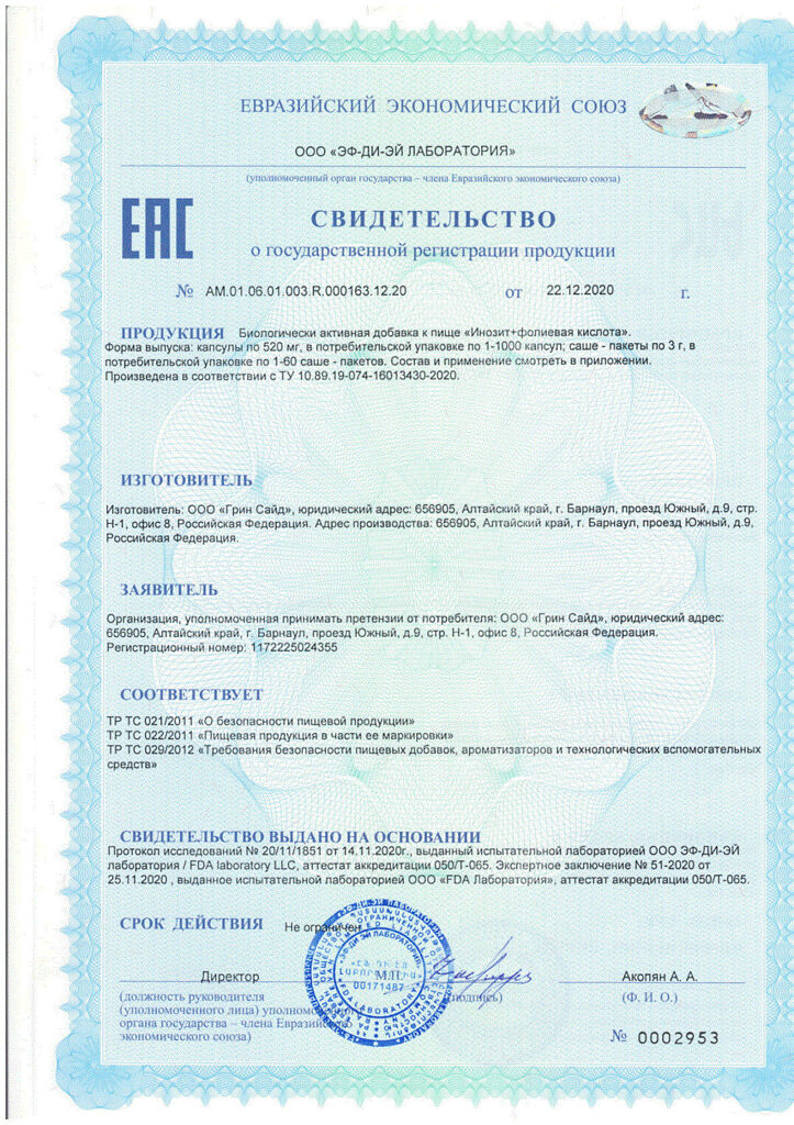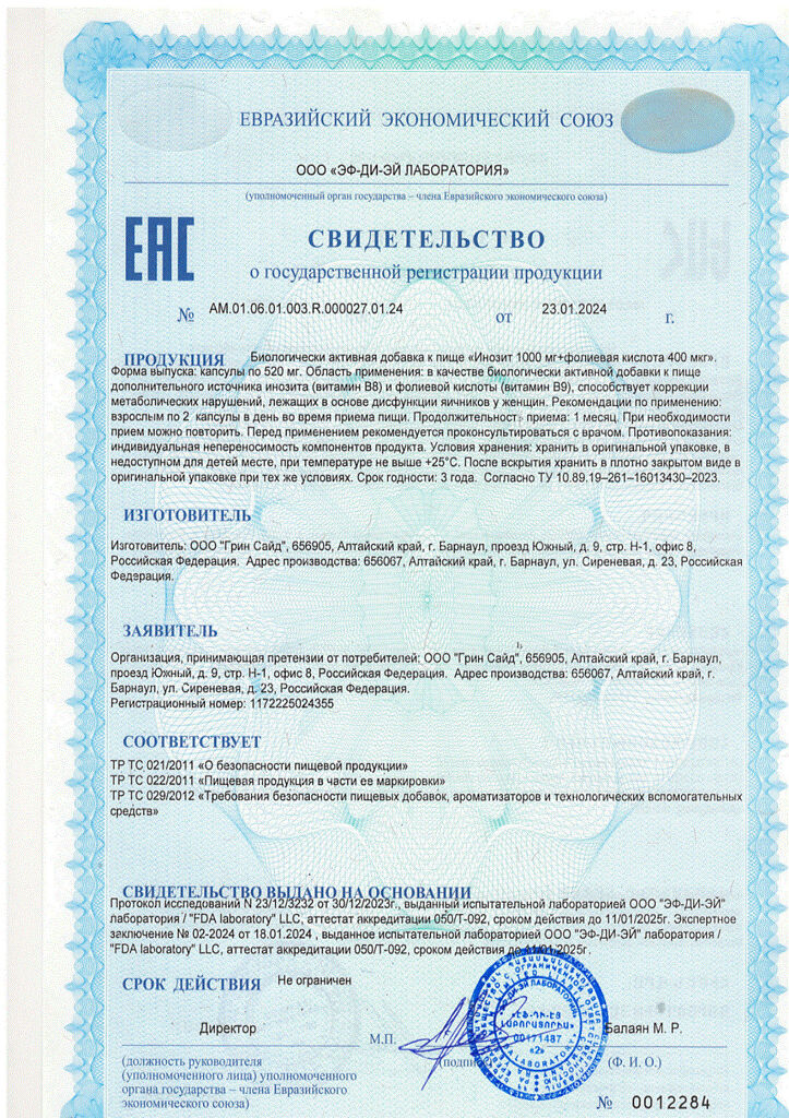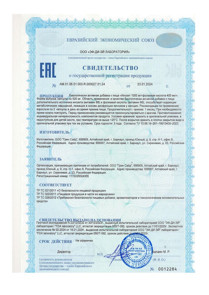 Документы Green Side Инозит 1000 мг+фолиевая кислота 400 мкг содержимое капсулы по 520 мг (масса капсулы 640 мг) 120 шт