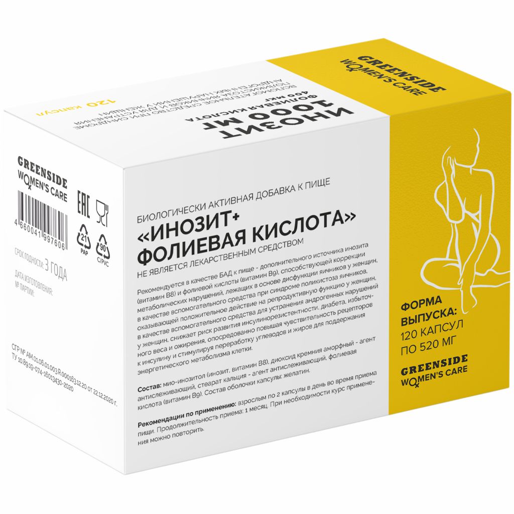 Green Side Инозит 1000 мг+фолиевая кислота 400 мкг содержимое капсулы по 520 мг (масса капсулы 640 мг) 120 шт