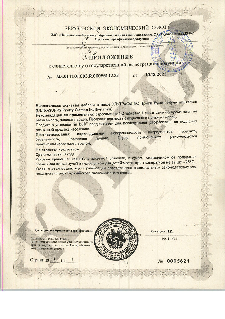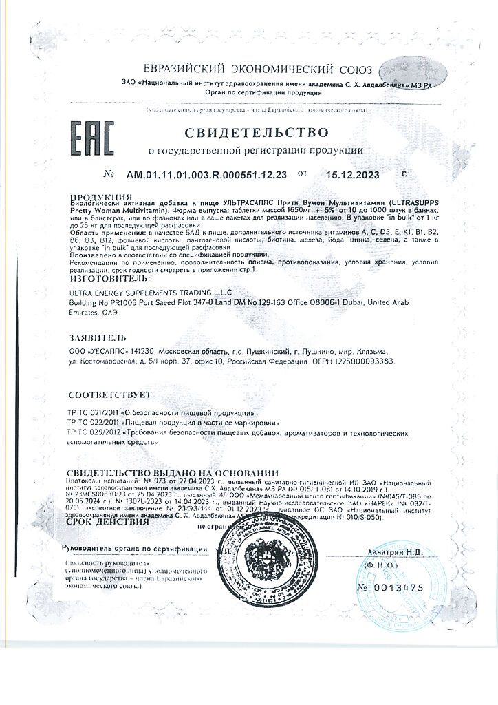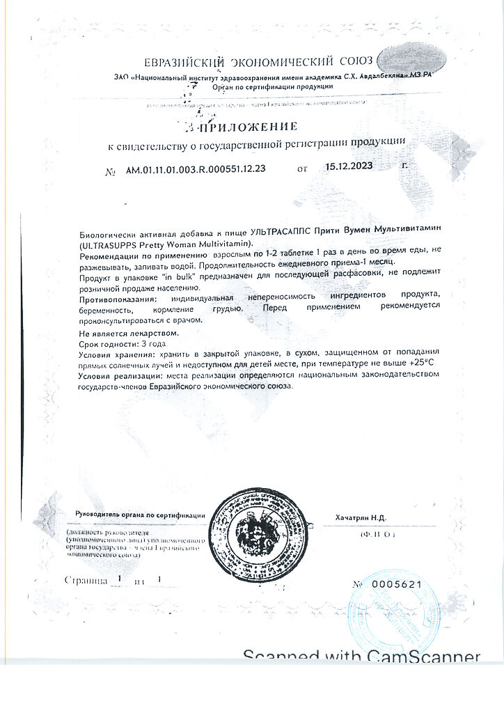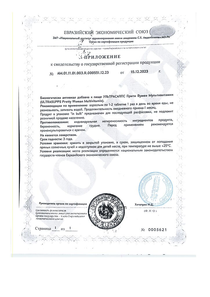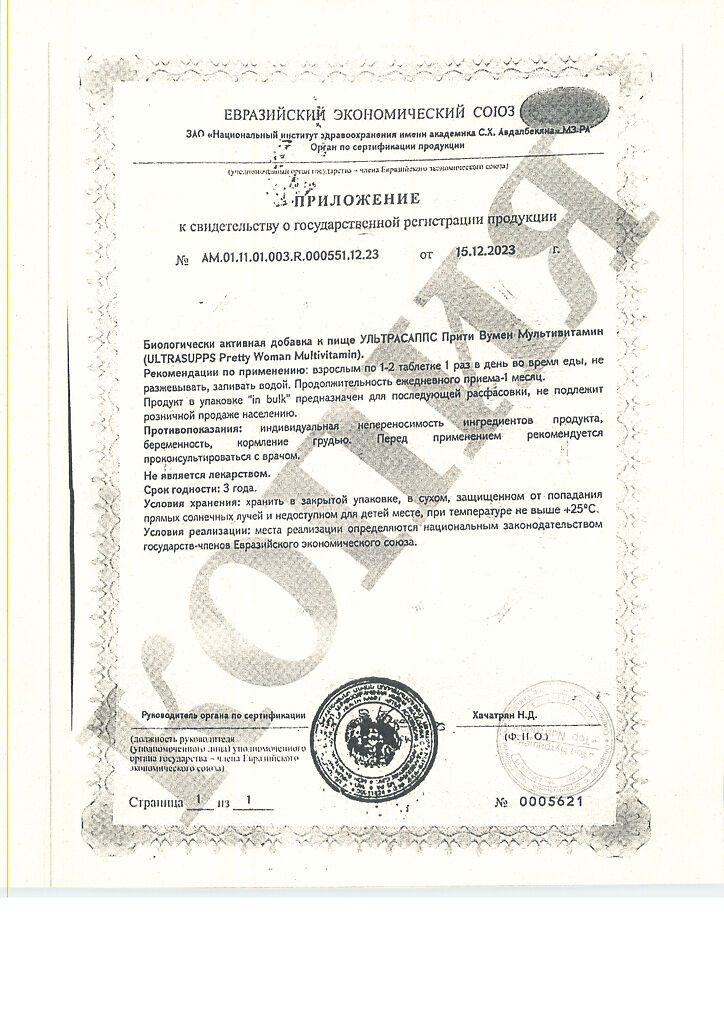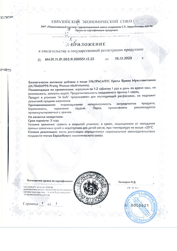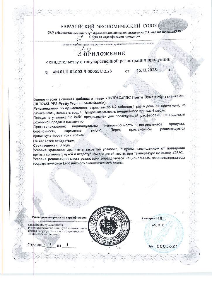 Документы Ультрасаппс Прити Вумен Мультивитамин / Ultrasupps Pretty Woman Multivitamin витаминно-минеральный комплекс для женщин таблетки массой 1650 мг 60 шт