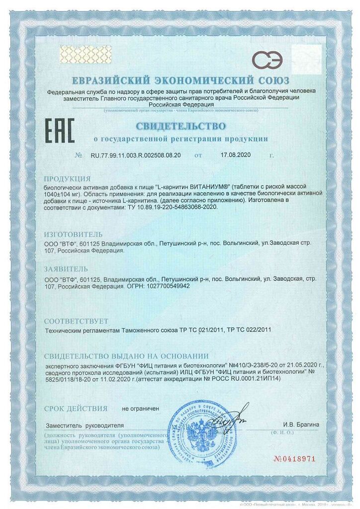 Документы Витаниум L-карнитин таблетки с риской массой 1040 мг 20 шт