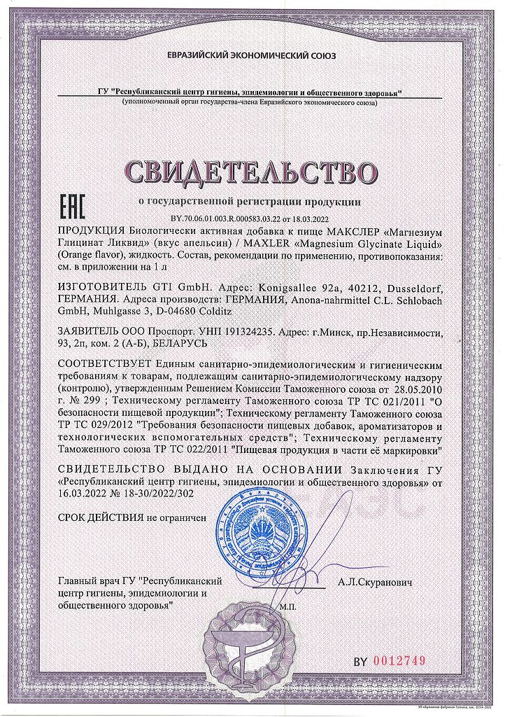 Документы Макслер Магнезиум Глицинат Ликвид / Maxler Magnesium Glycinate Liquid Orange flavor фл 500 мл 1 шт