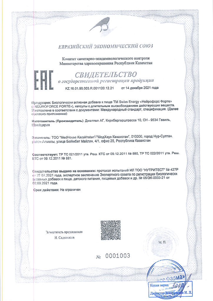 Документы Swiss Energy Нейрофорс Форте / Neuroforce Forte капсулы с длительным высвобождением действующих веществ по 862 мг 30 шт