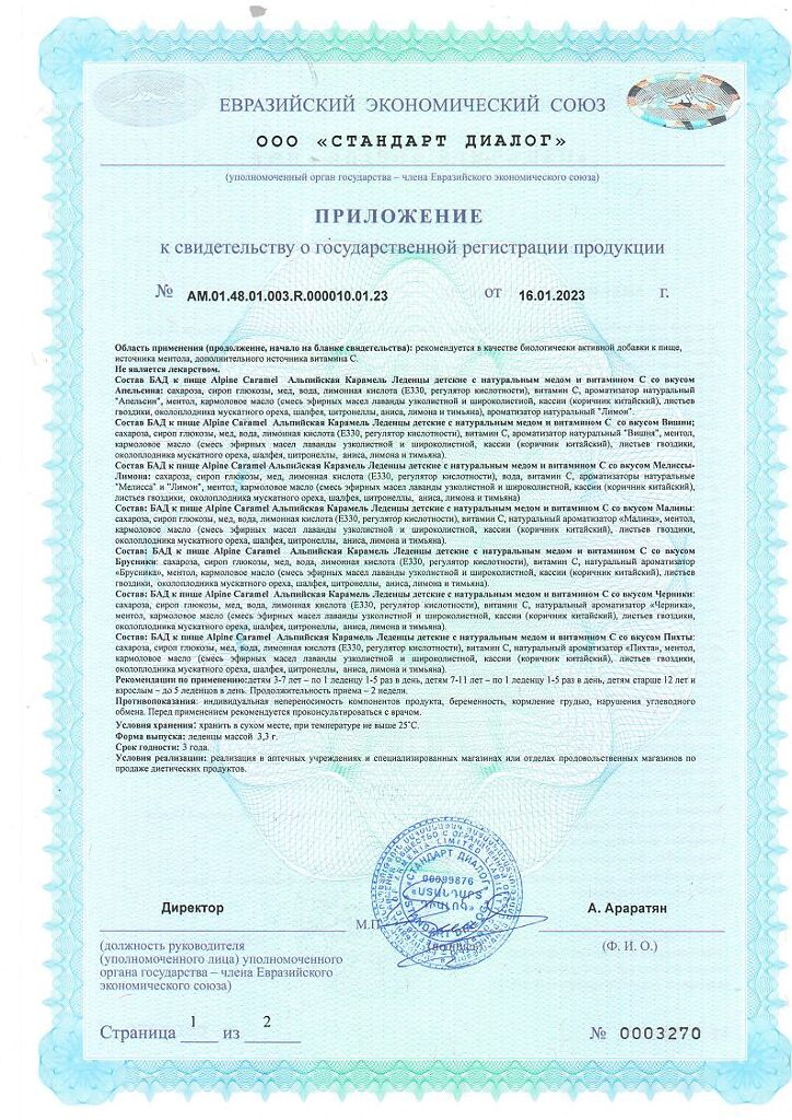 Документы Альпийская Карамель / Alpine Caramel Леденцы детские с натуральным медом и вит С со вкусом Пихты массой 3,3 г мини-бокс 53 г 1 шт