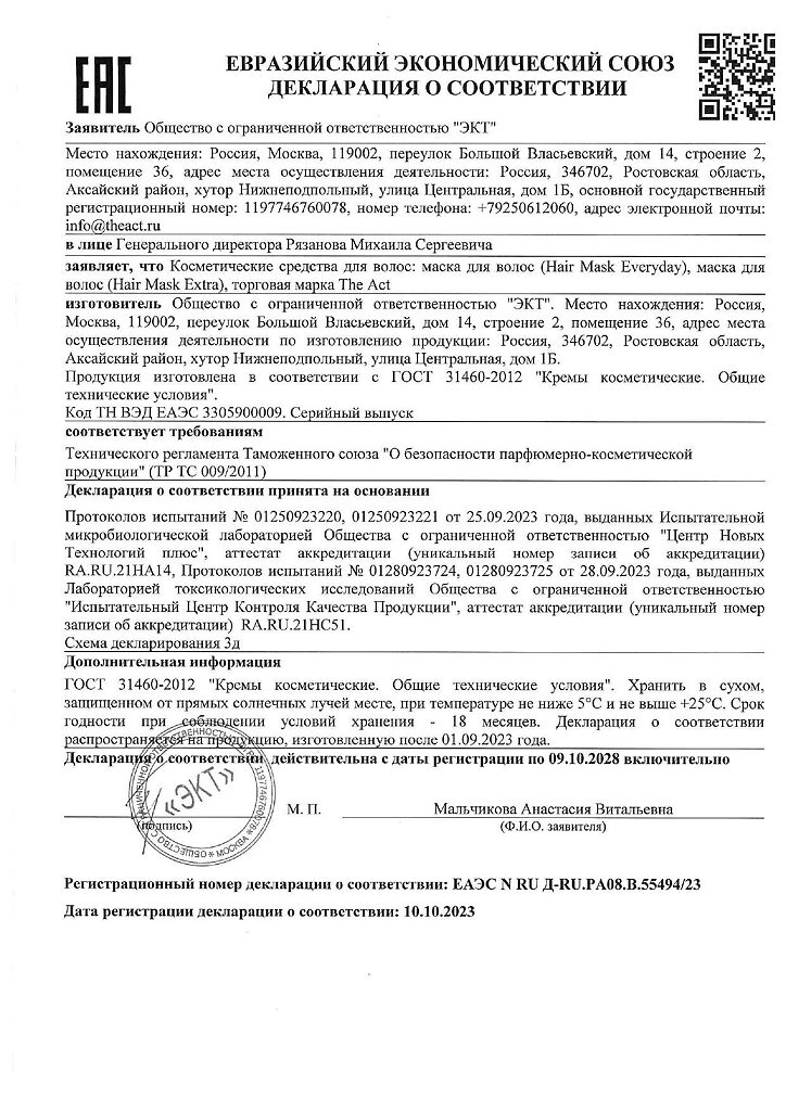 Документы The Act Маска-кондиционер 2 в 1 Everyday с маслами и растительными протеинами 200 мл 1 шт