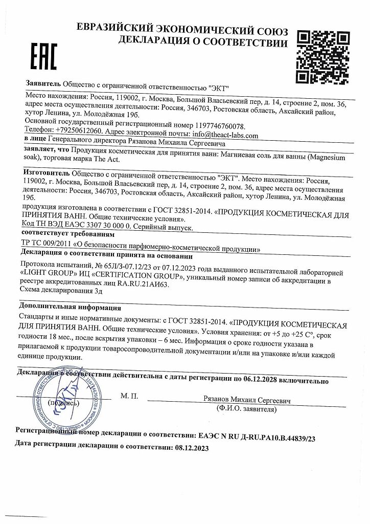Документы The Act Магниевая соль для ванн с иланг-илангом 400 г 1 шт
