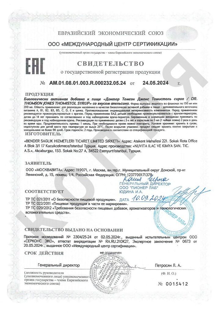 Документы Dr. Thomson Jones Thomistol Syrup / Доктор Томсон Джонс Томистоль сироп со вкусом апельсина жидкость во флаконах по 150 мл 1 шт