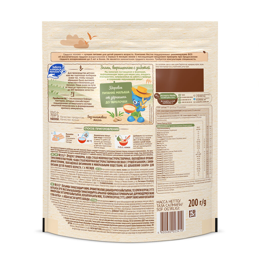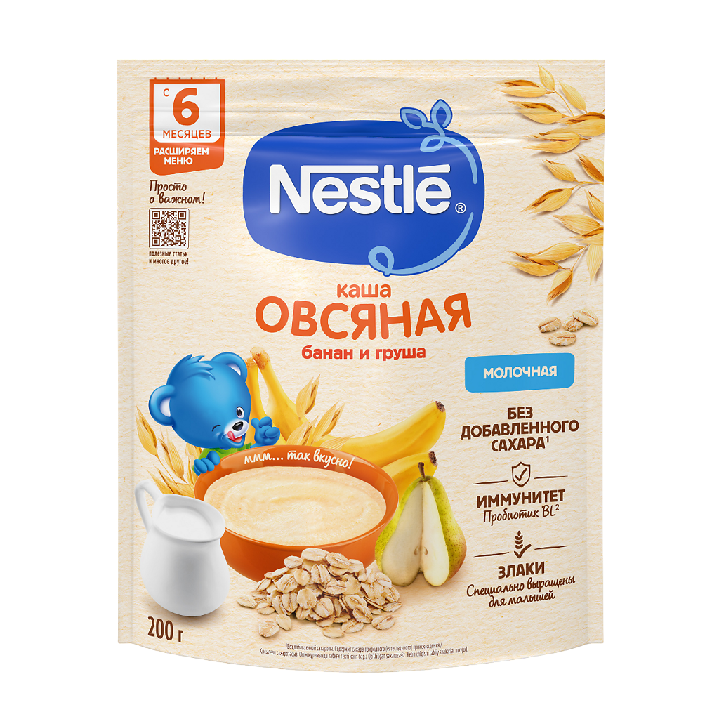 Nestle Каша молочная овсяная с грушей и бананом с пробиотиком BL с 6 мес пакет 200 г 1 шт: отзывы покупателей и фармацевтов