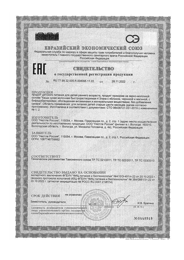 Документы Nestle Каша молочная мультизлаковая с яблоком, черникой и малиной с пробиотиком BL с 6 мес пакет 200 г 1 шт