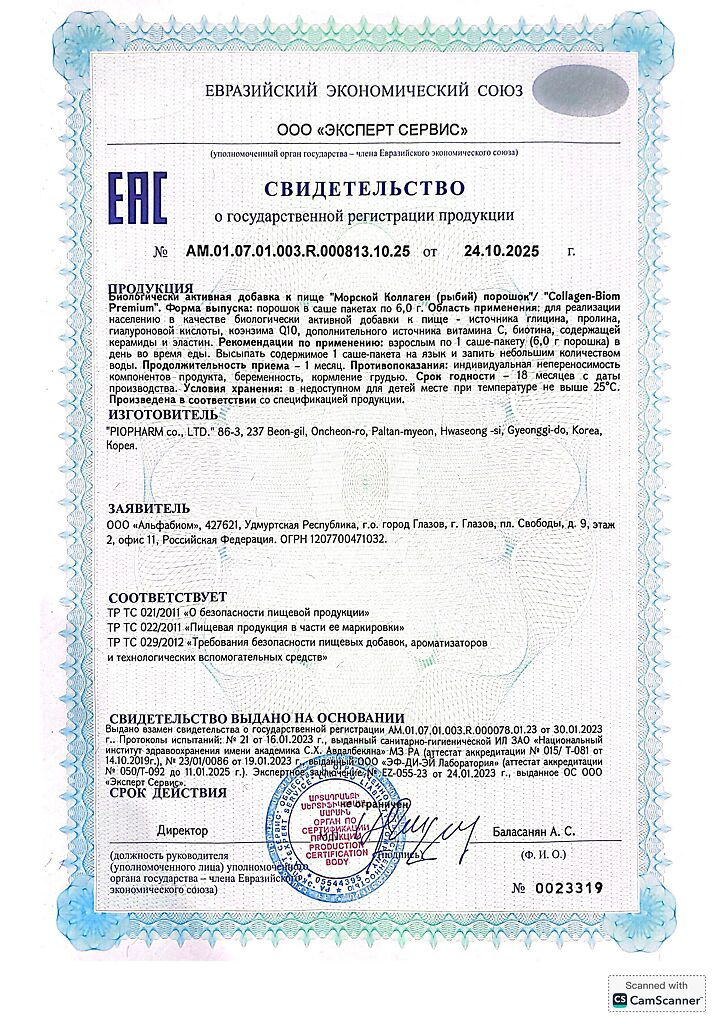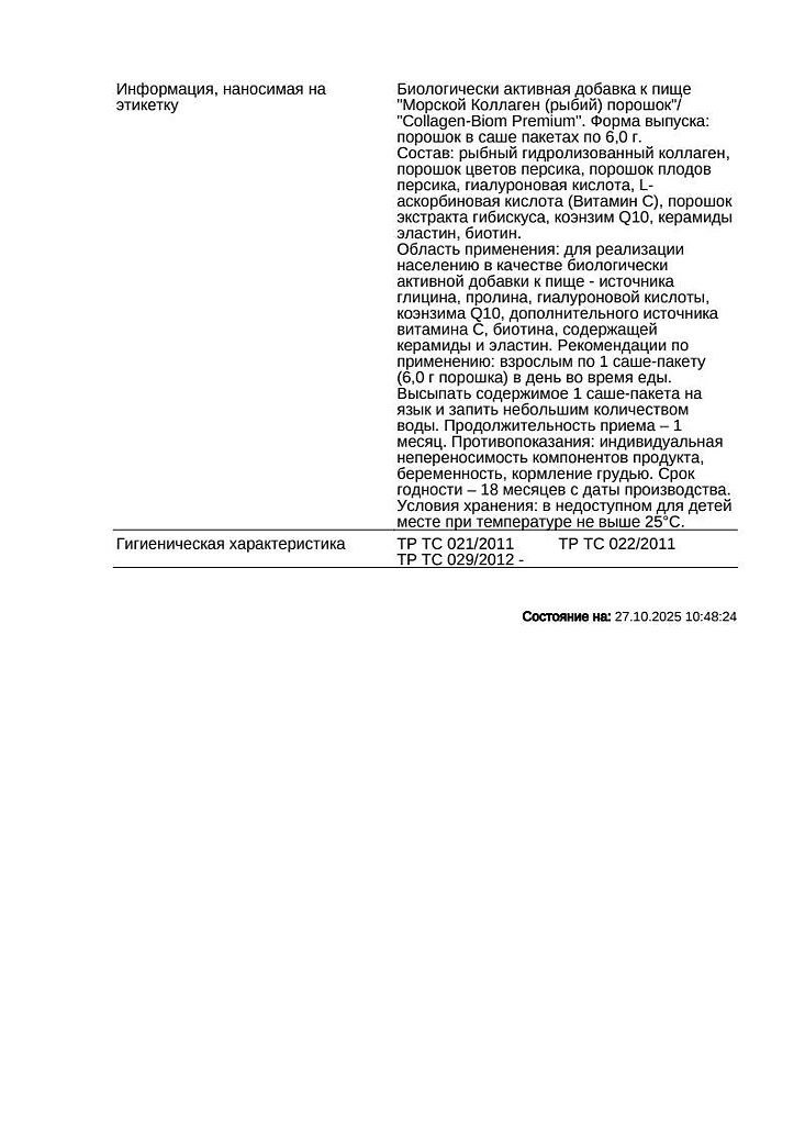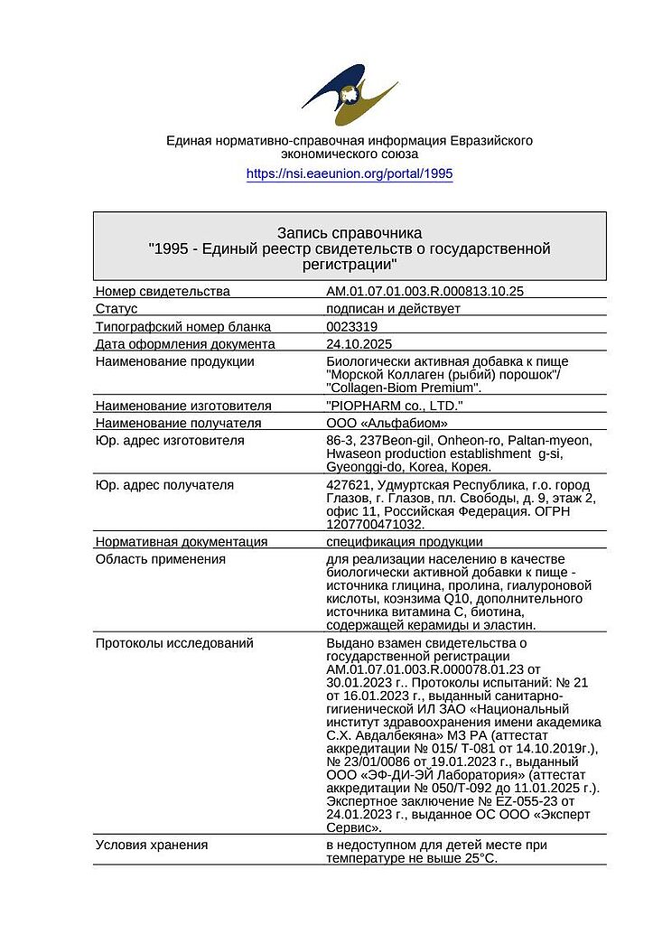 Документы Пептидный морской коллаген Collagen-Biom Premium 5000 мг