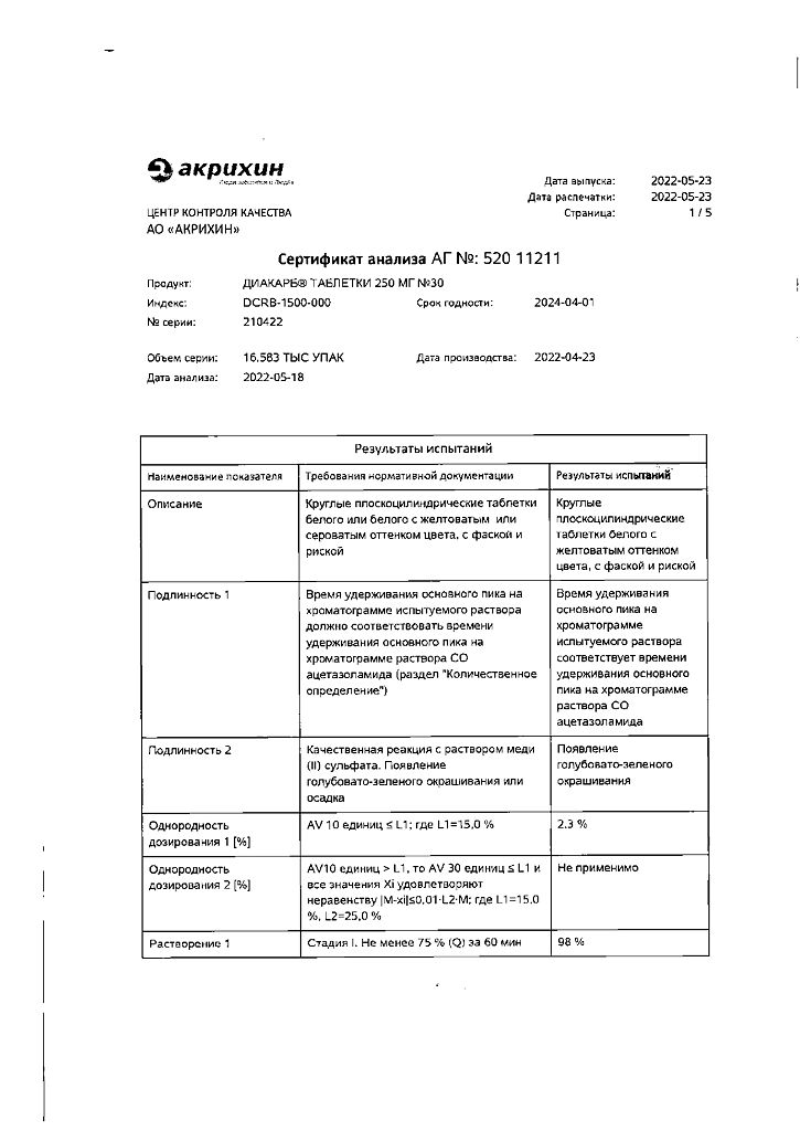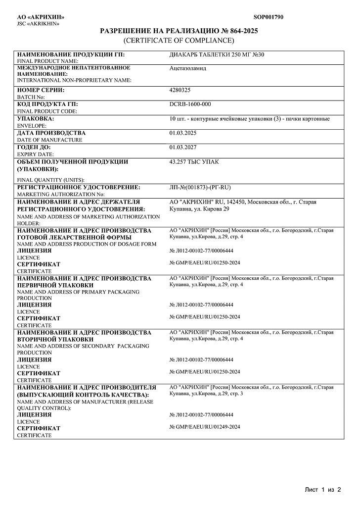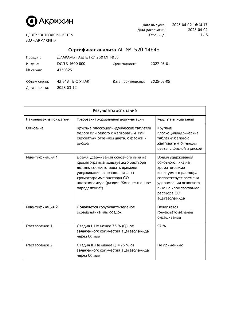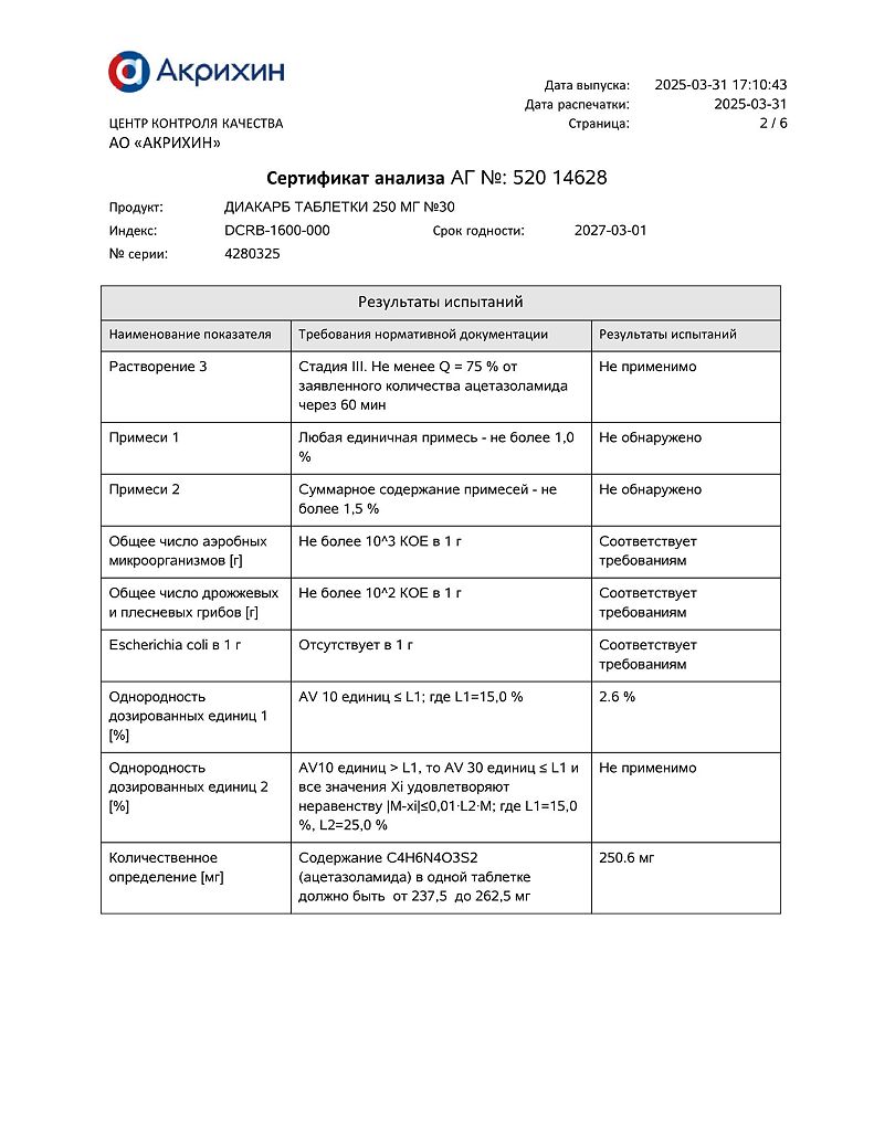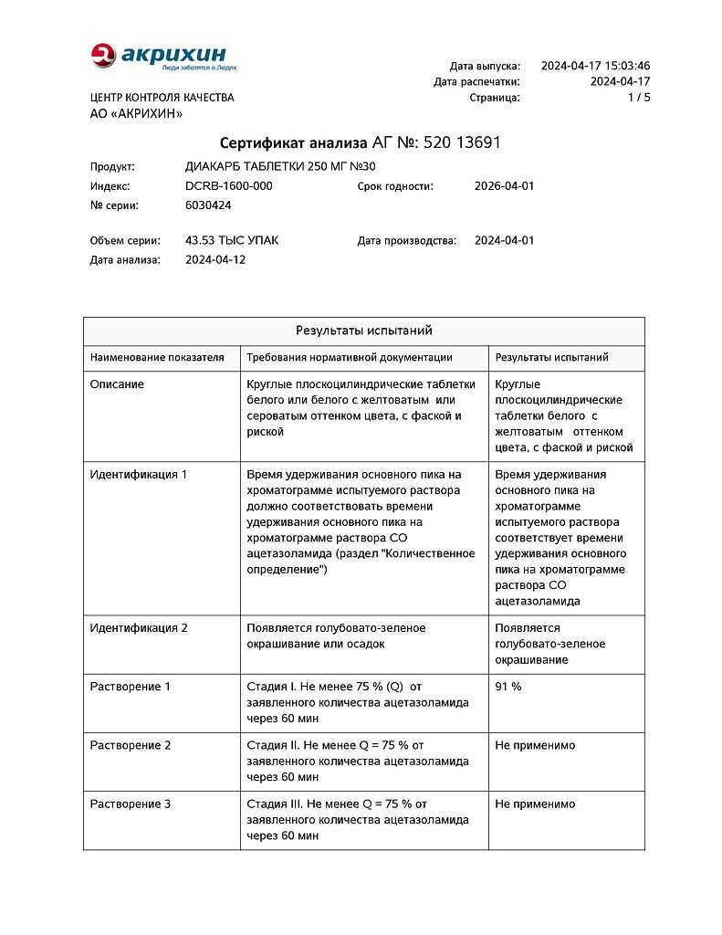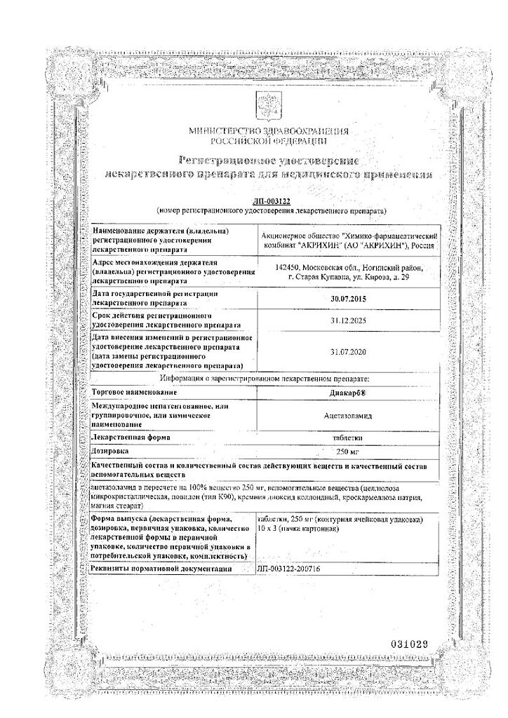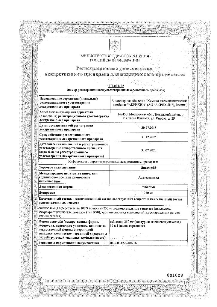 После приема внутрь ацетазоламид хорошо абсорбируется из ЖКТ. После приема Диакарба в дозе 500 мг C max активного вещества составляет 12-27 мкг/мл и достигается через 1-3 ч. Определяемая концентрация ацетазоламида в плазме сохраняется в течение 24 ч после приема препарата.
