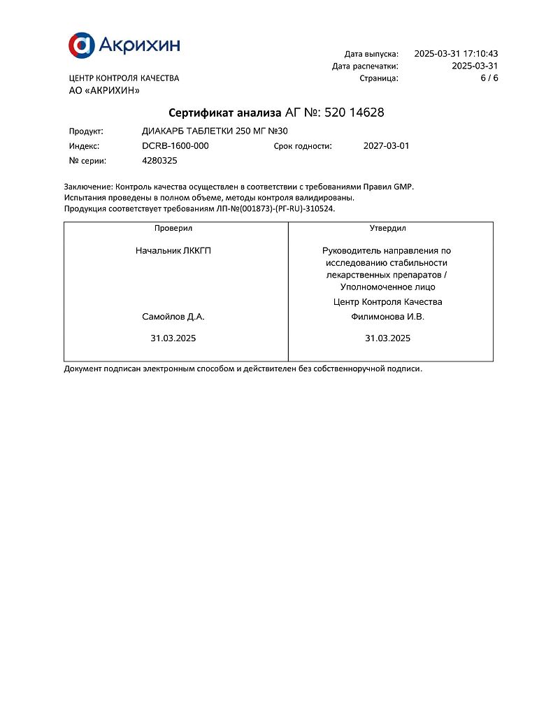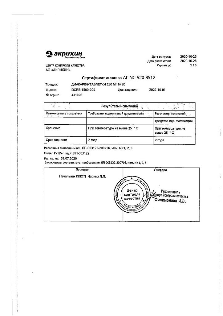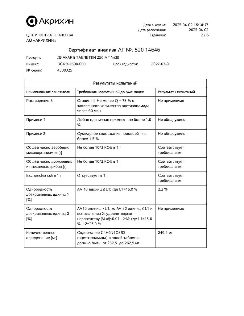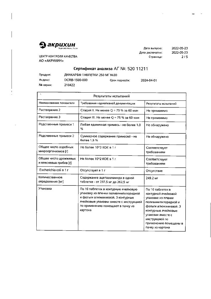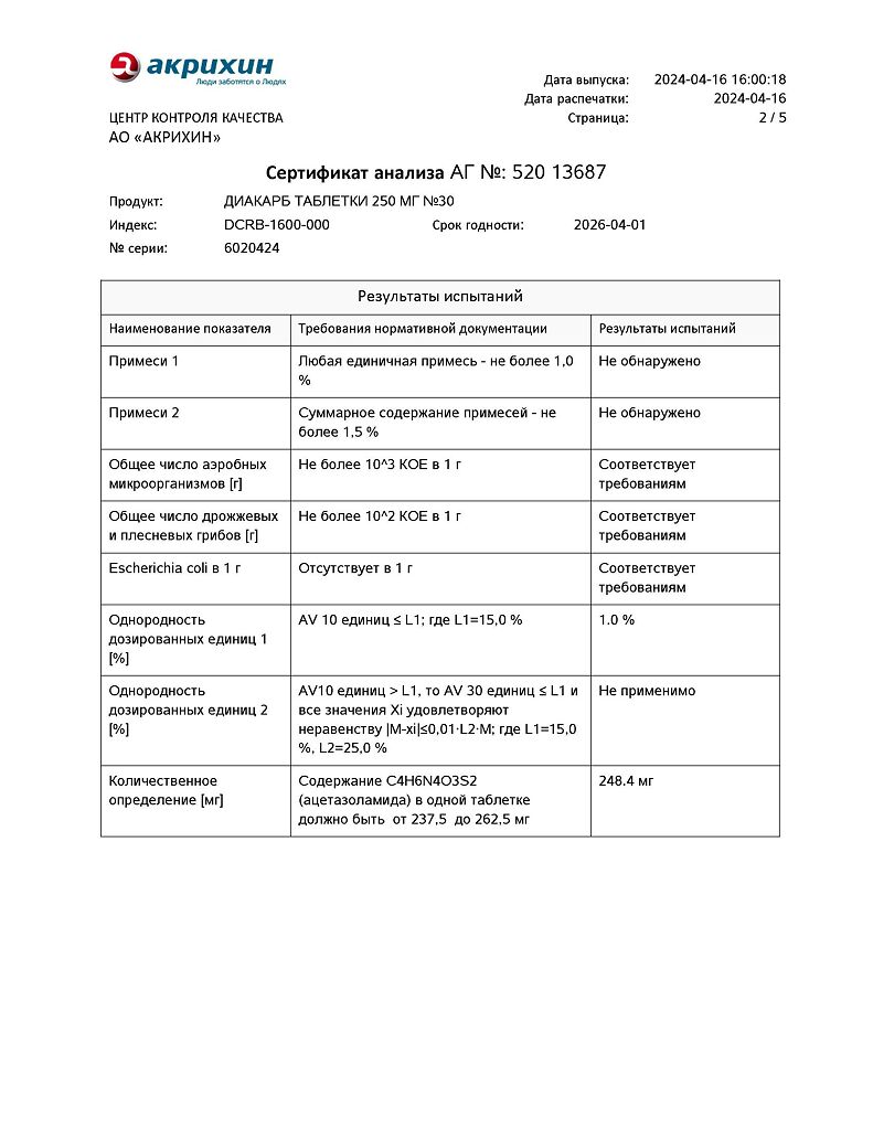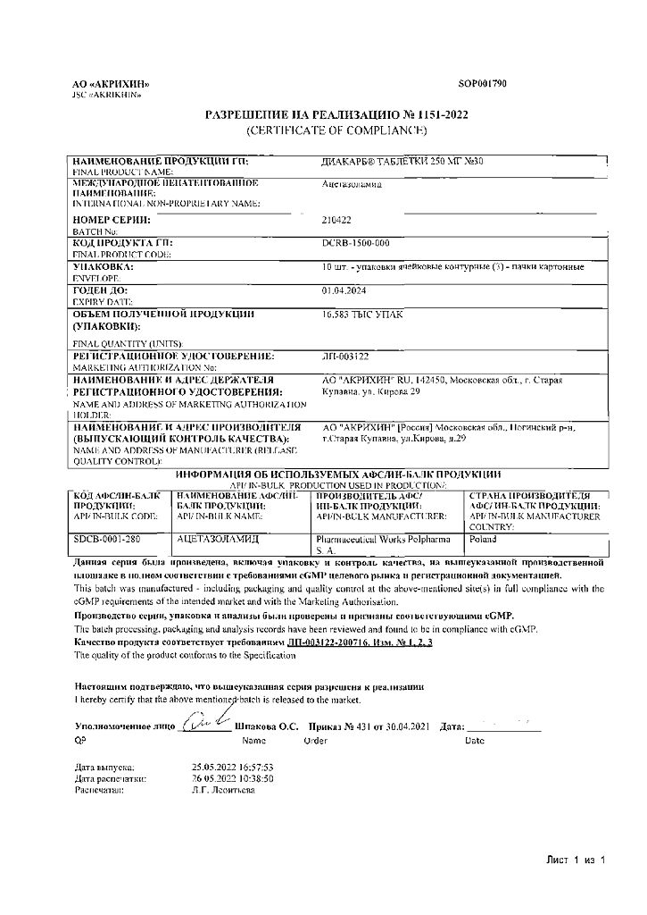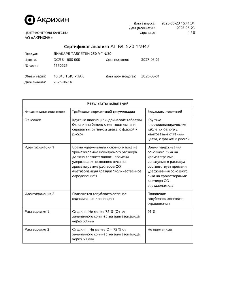 После приема внутрь ацетазоламид хорошо абсорбируется из ЖКТ. После приема Диакарба в дозе 500 мг C max активного вещества составляет 12-27 мкг/мл и достигается через 1-3 ч. Определяемая концентрация ацетазоламида в плазме сохраняется в течение 24 ч после приема препарата.