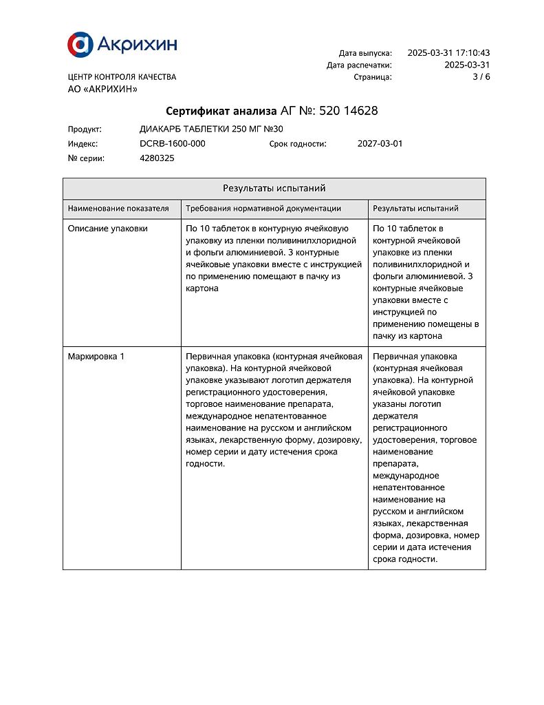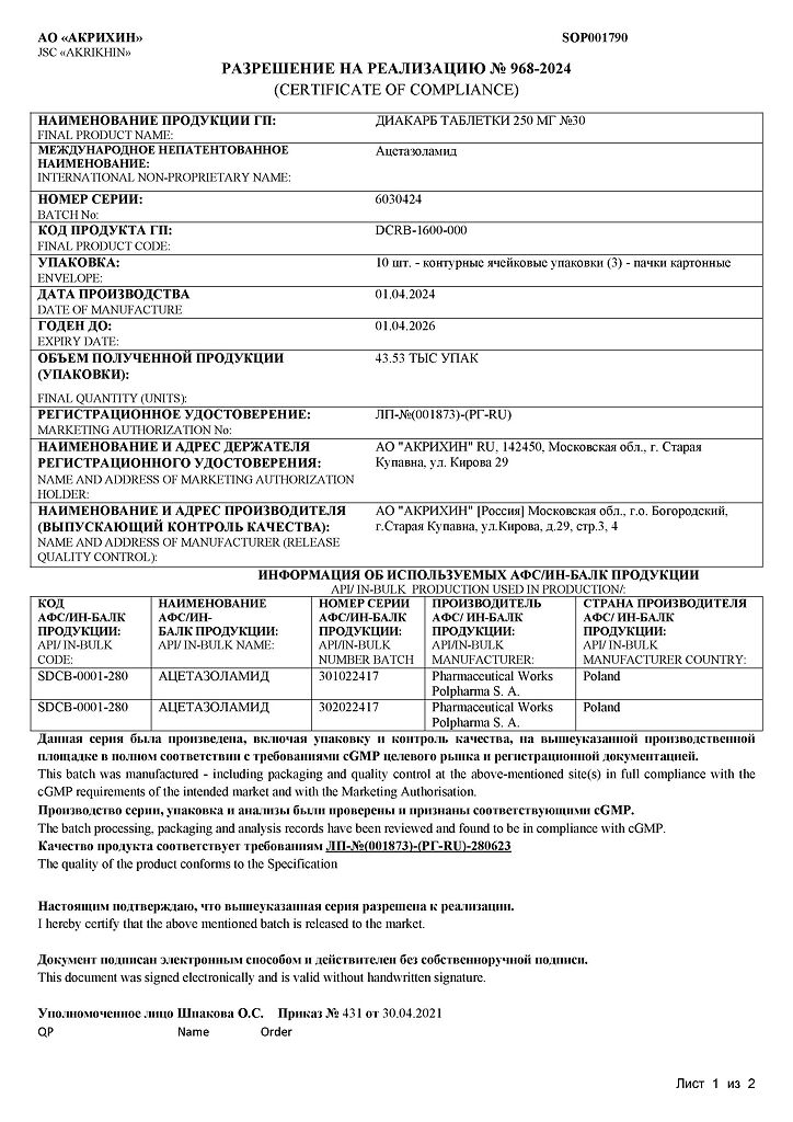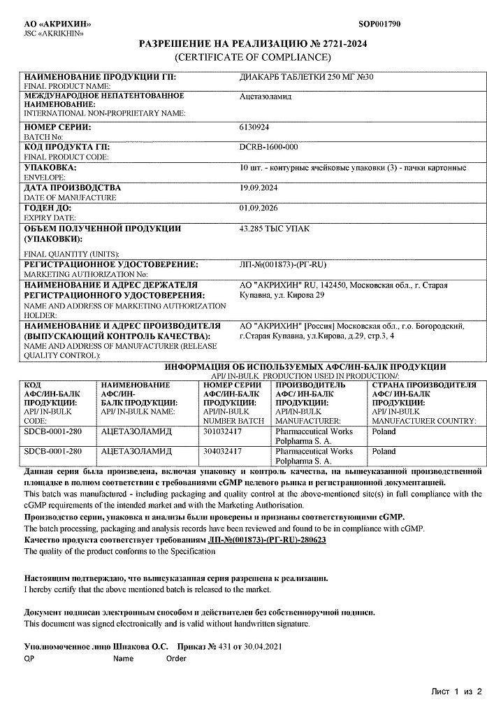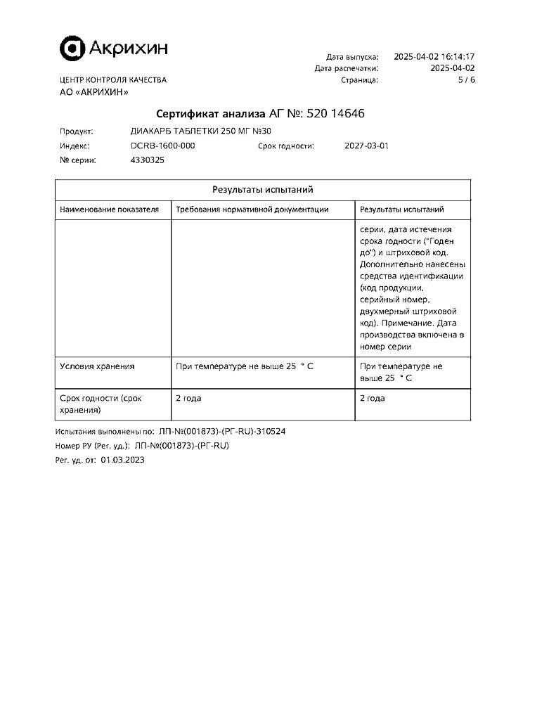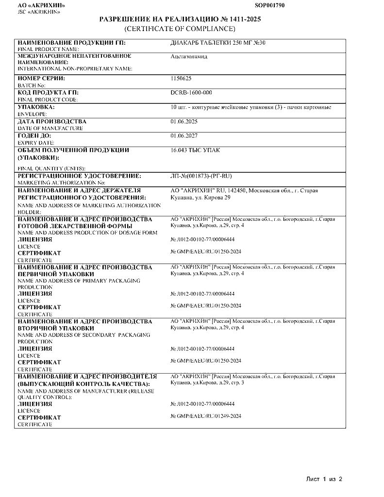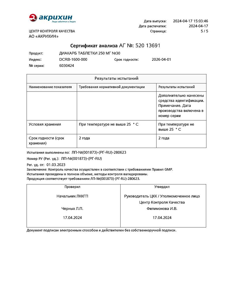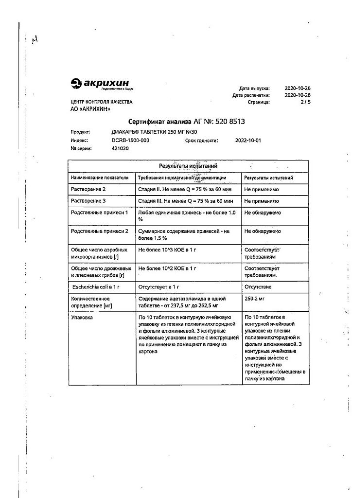 После приема внутрь ацетазоламид хорошо абсорбируется из ЖКТ. После приема Диакарба в дозе 500 мг C max активного вещества составляет 12-27 мкг/мл и достигается через 1-3 ч. Определяемая концентрация ацетазоламида в плазме сохраняется в течение 24 ч после приема препарата.