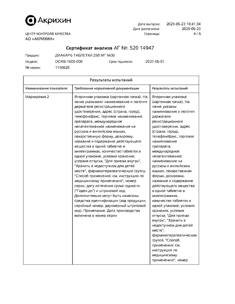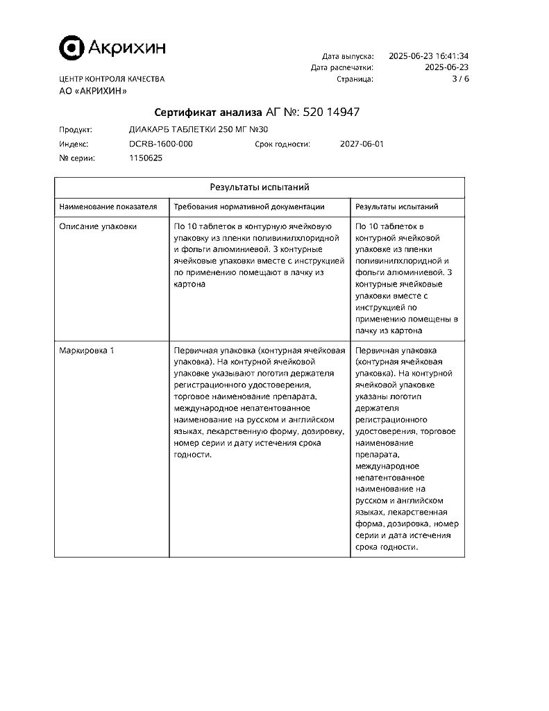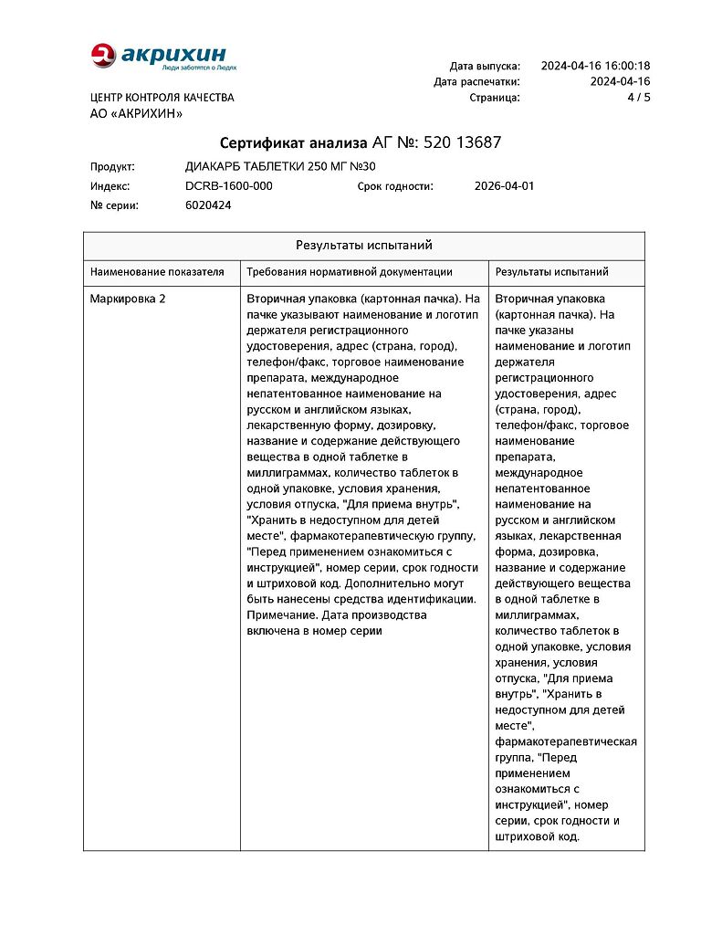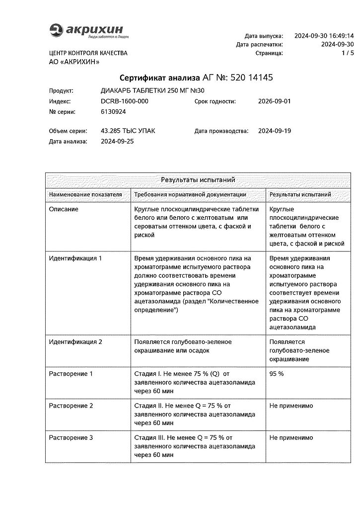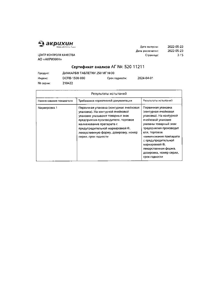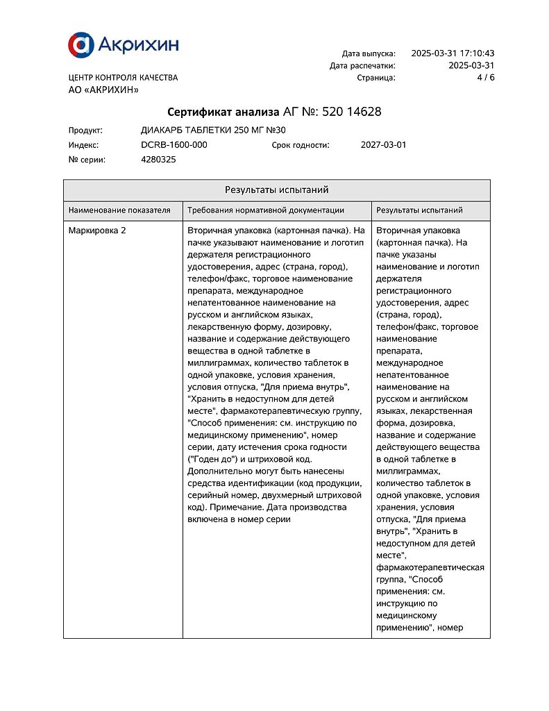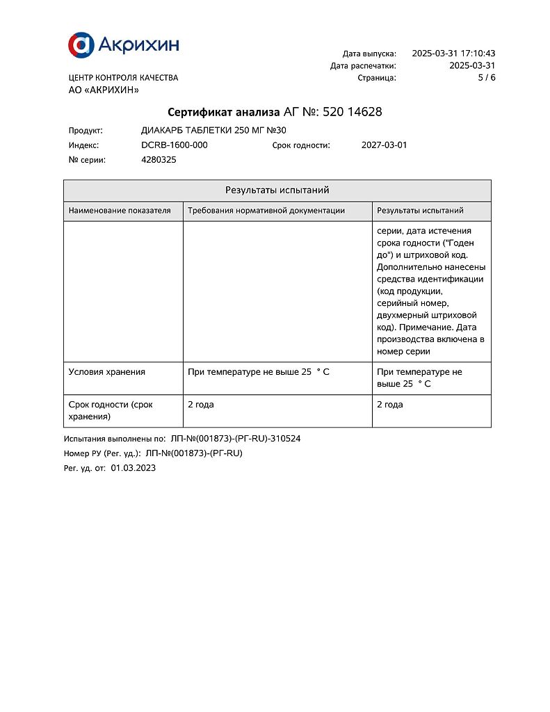 После приема внутрь ацетазоламид хорошо абсорбируется из ЖКТ. После приема Диакарба в дозе 500 мг C max активного вещества составляет 12-27 мкг/мл и достигается через 1-3 ч. Определяемая концентрация ацетазоламида в плазме сохраняется в течение 24 ч после приема препарата.