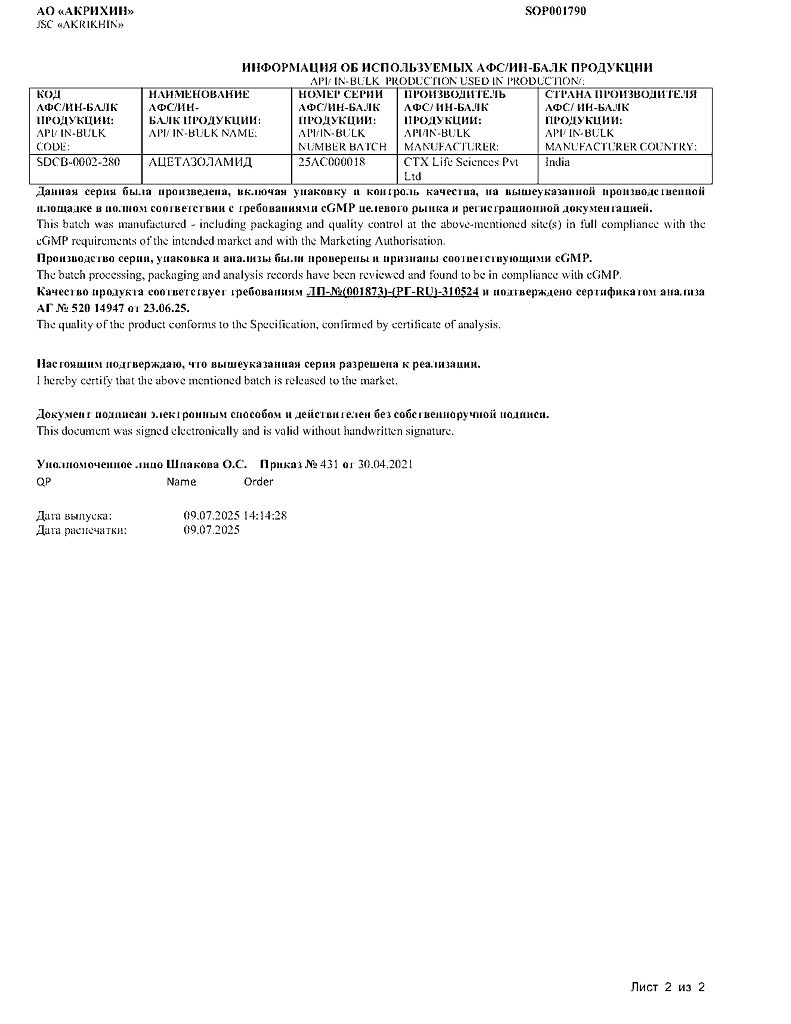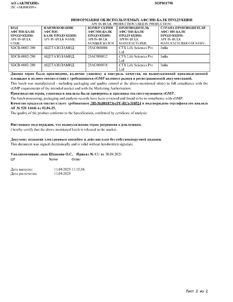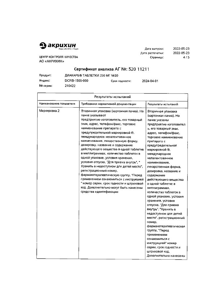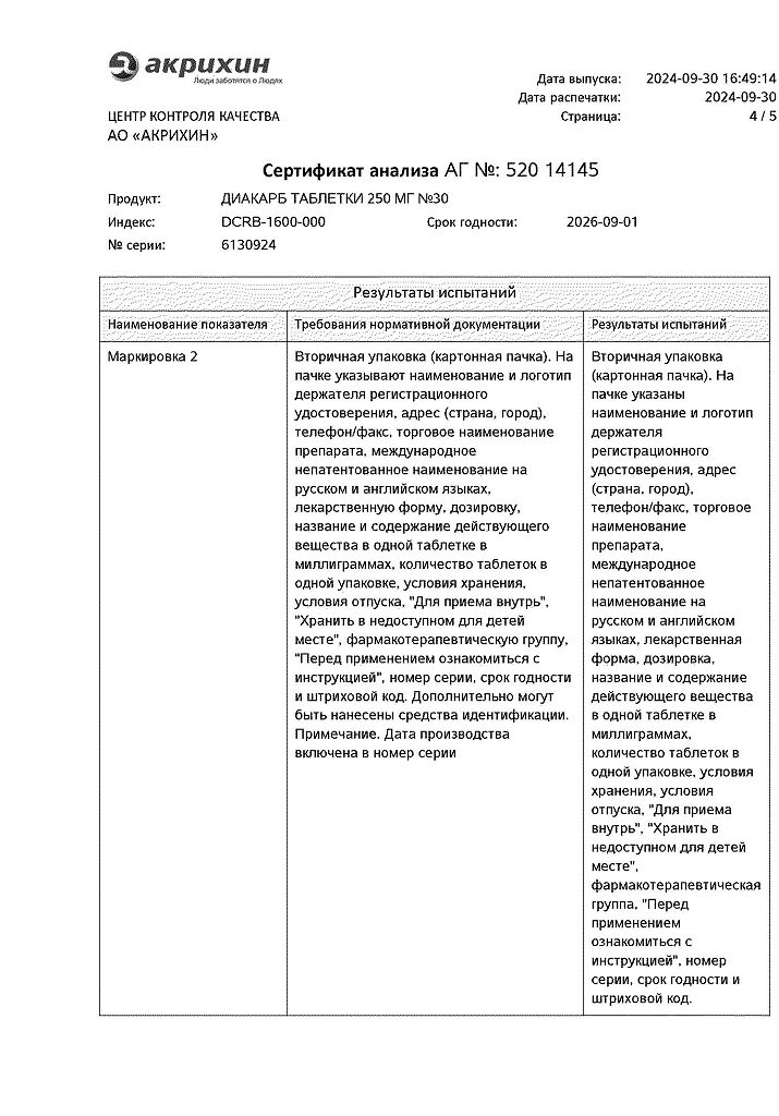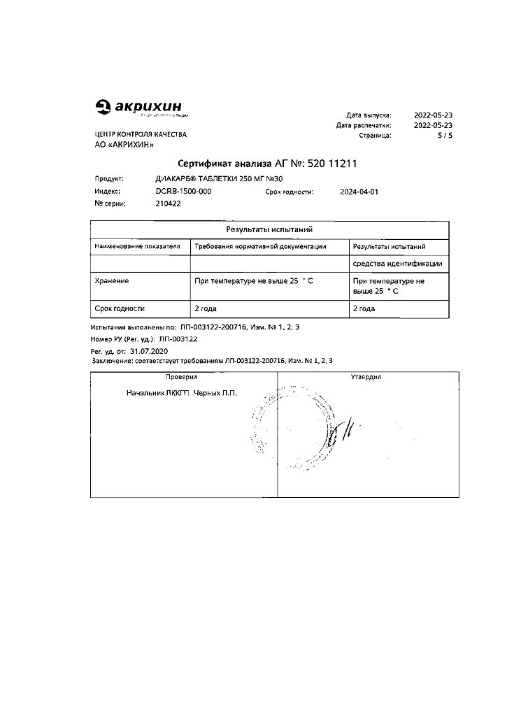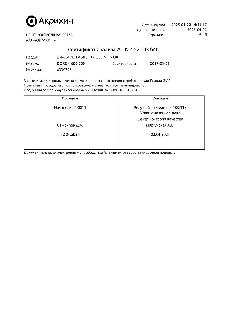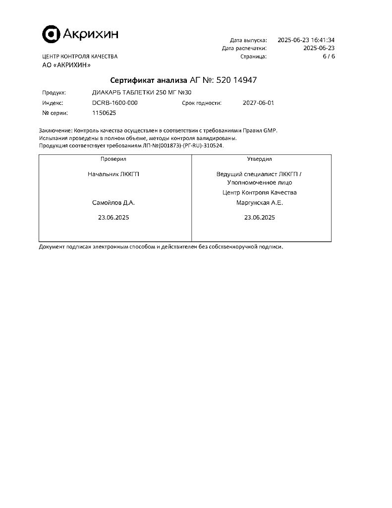 После приема внутрь ацетазоламид хорошо абсорбируется из ЖКТ. После приема Диакарба в дозе 500 мг C max активного вещества составляет 12-27 мкг/мл и достигается через 1-3 ч. Определяемая концентрация ацетазоламида в плазме сохраняется в течение 24 ч после приема препарата.