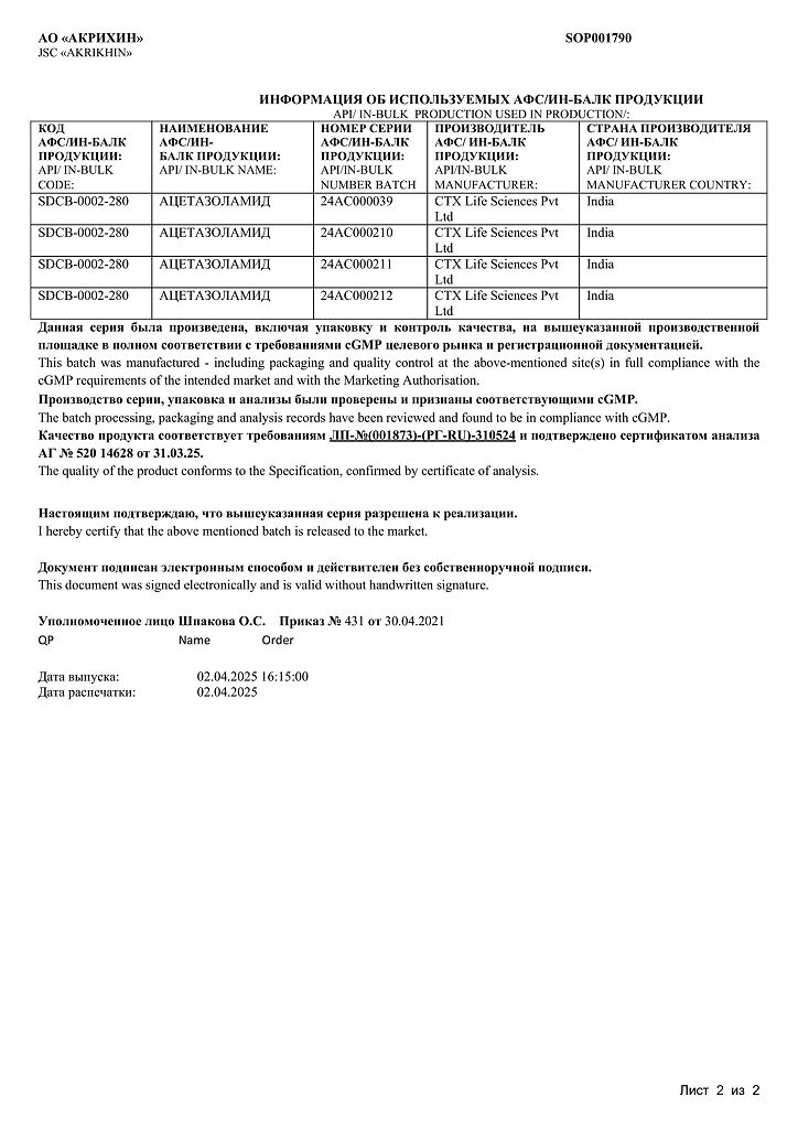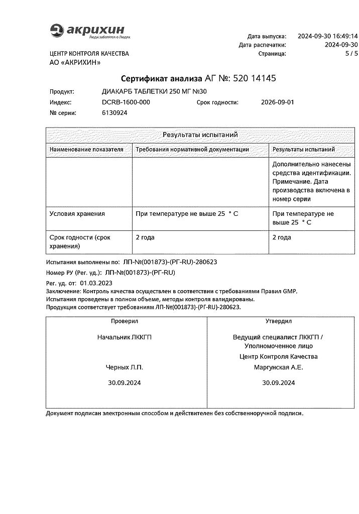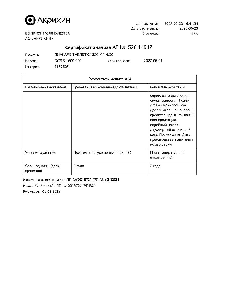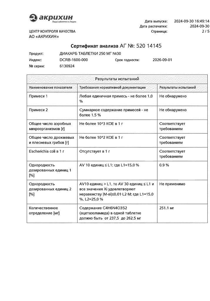 Препарат Диакарб нельзя назначать более 5 дней подряд. При длительном использовании необходимо контролировать картину крови и электролитный баланс. Рекомендуется диета, богатая калием и/или прием . обезболивающие противоспалительные и гормоны-кортикостреоиды снижают эффект препарата Диакарб.