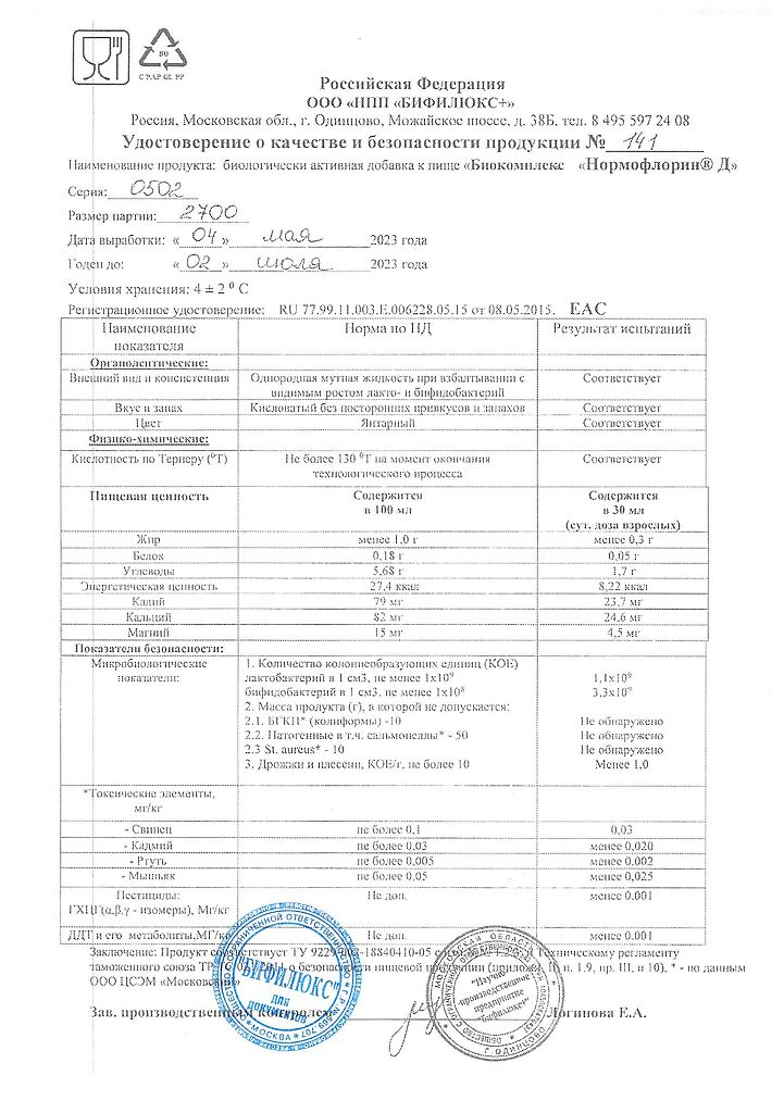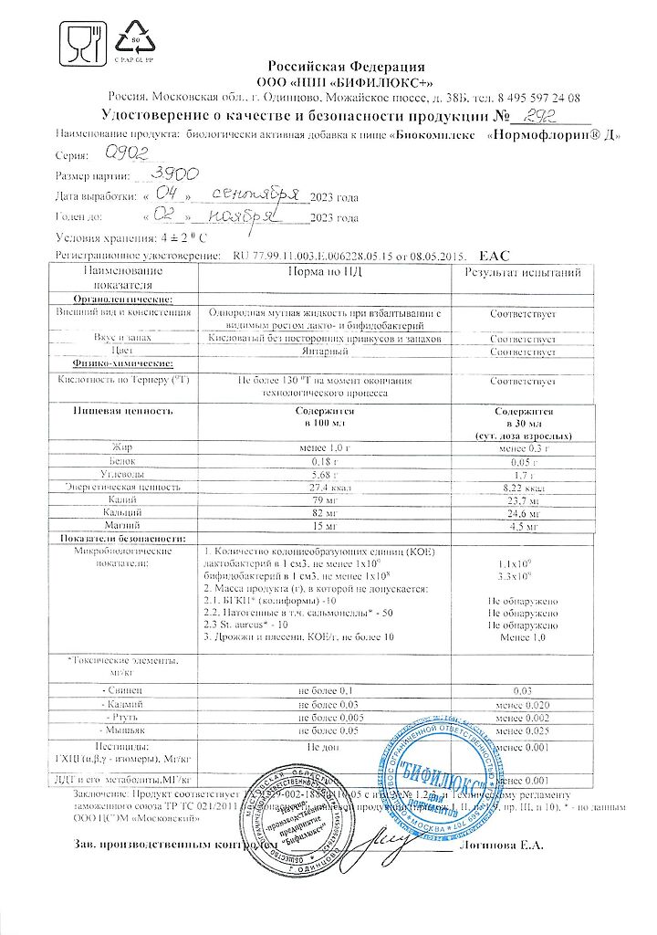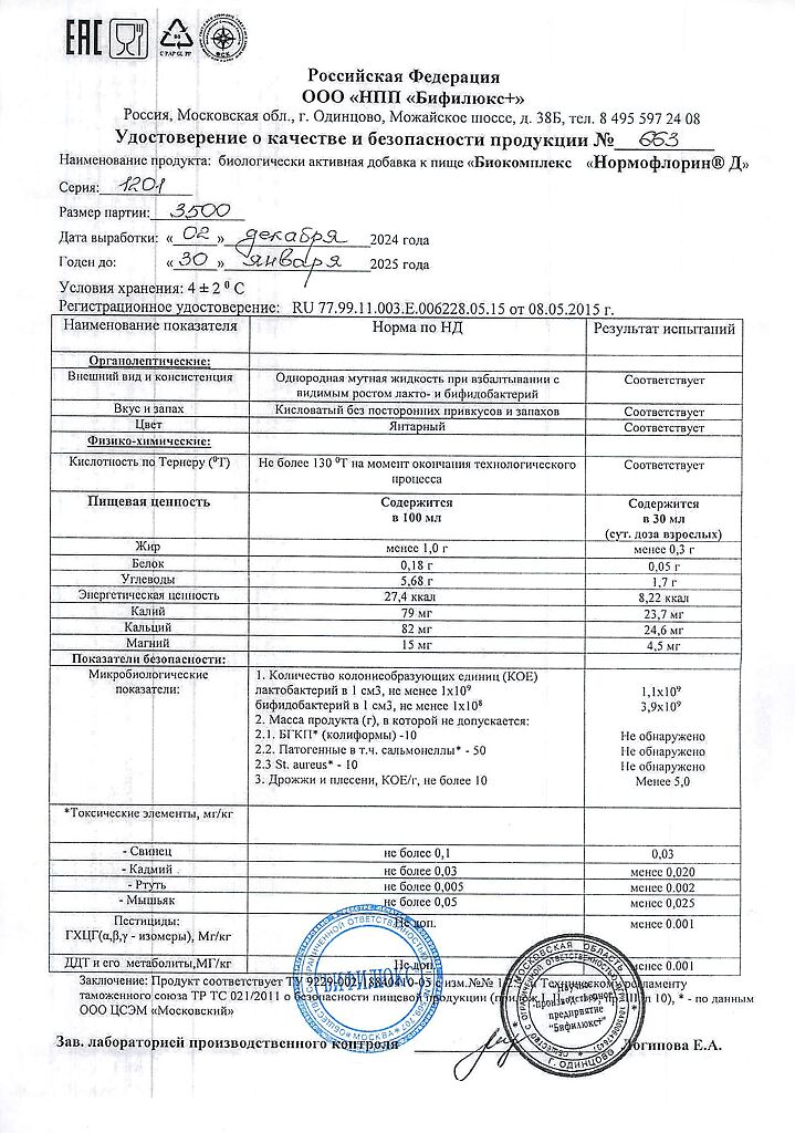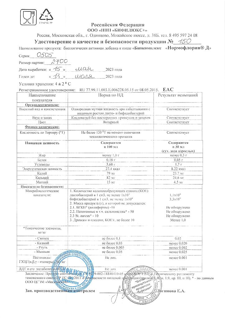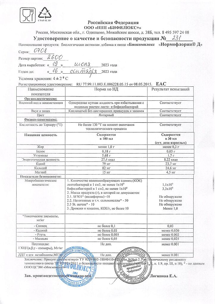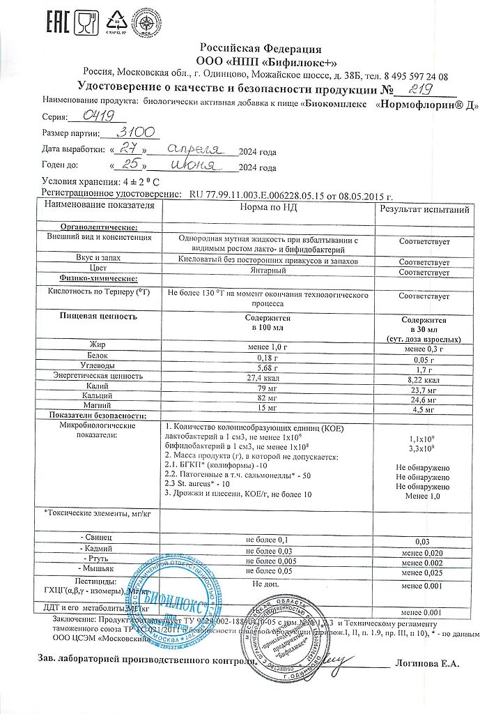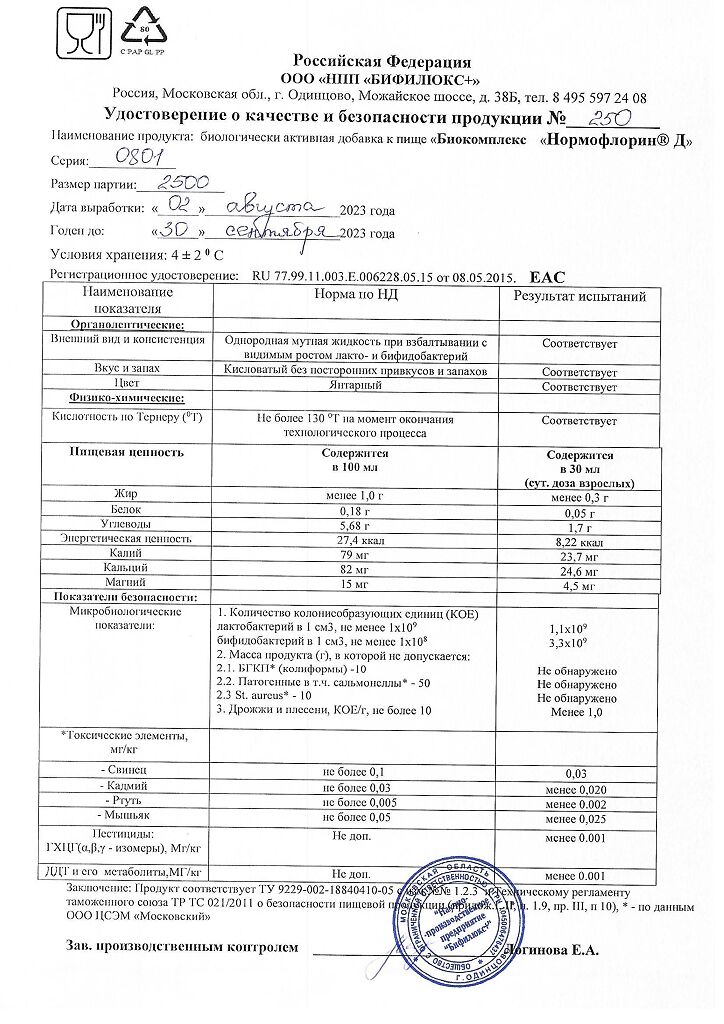 Загрязнители, нормируемые СанПин 2.3.2.1078-01, в биокомплексах Нормофлорин Д не обнаружены. Компоненты среды и сырья, применяемые при культивировании культур лактобактерий, являются разрешенными в качестве пищевых субстратов.