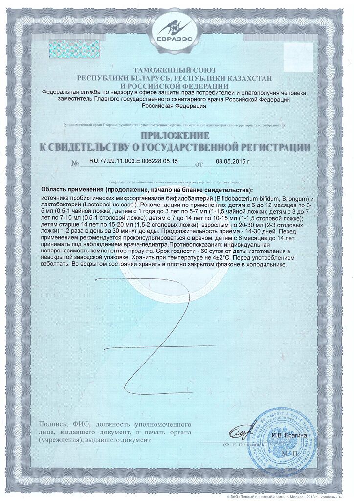 В соответствии с сертификатом «Эффективные биокорректоры» № СДС.Б00021 от 12.07.07 г. эффективен в комплексной терапии язвенной болезни желудка или двенадцатиперстной кишки, постхолецистэктомического синдрома, целиакии; метаболического синдрома и ожирения; ИБС, дерматитов различной этиологии. Восстанавливает нарушенный микробиоценоз на фоне антибактериальной терапии. Устраняет дибиотические нарушения кишечника у недоношенных детей. Эффективен в комплексной терапии детей с лактазной недостаточностью, эрозивным гастритом, пищевой аллергией. Эффективен в комплексной терапии вульвовагинита, кольпита, кандидоза и сальпингоофорита.