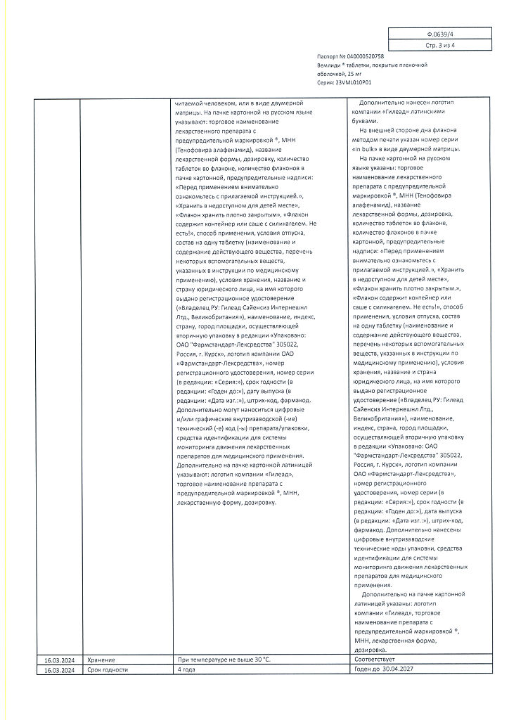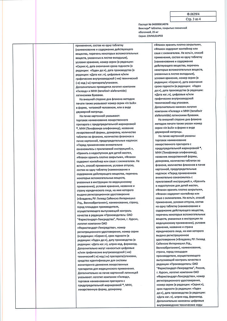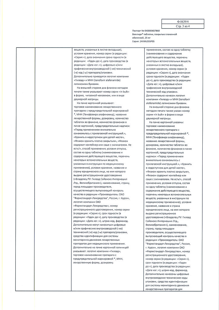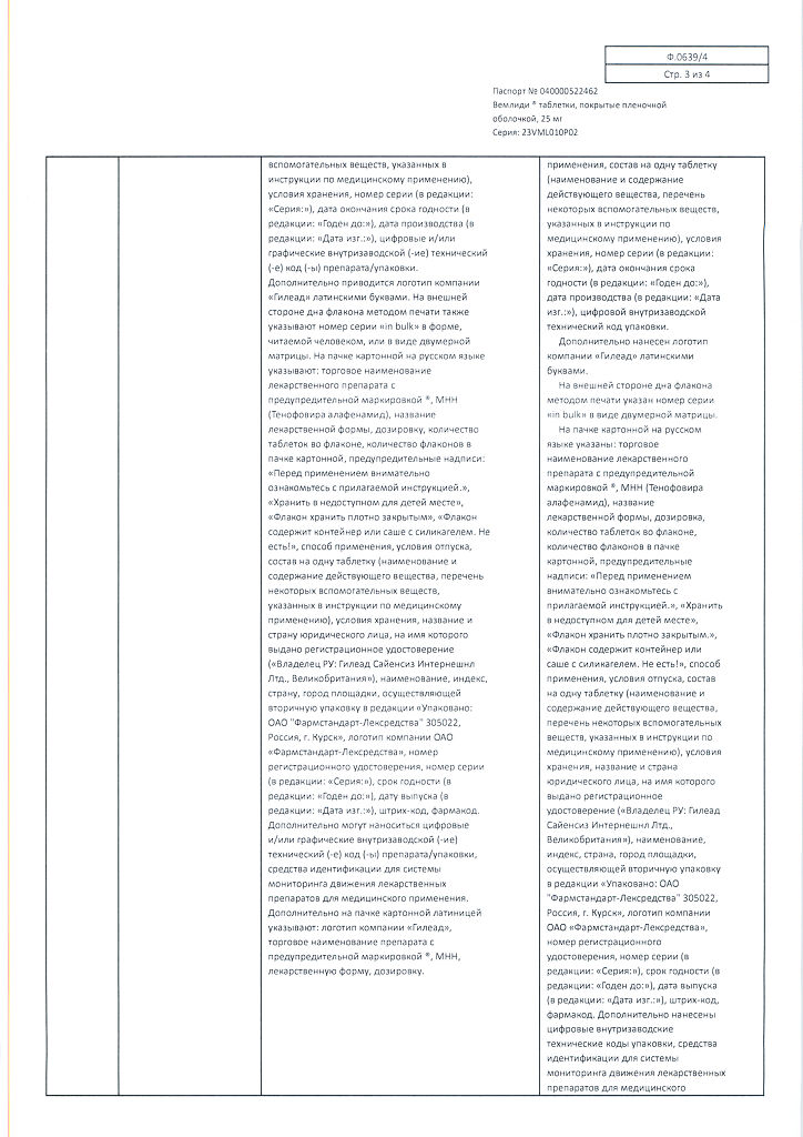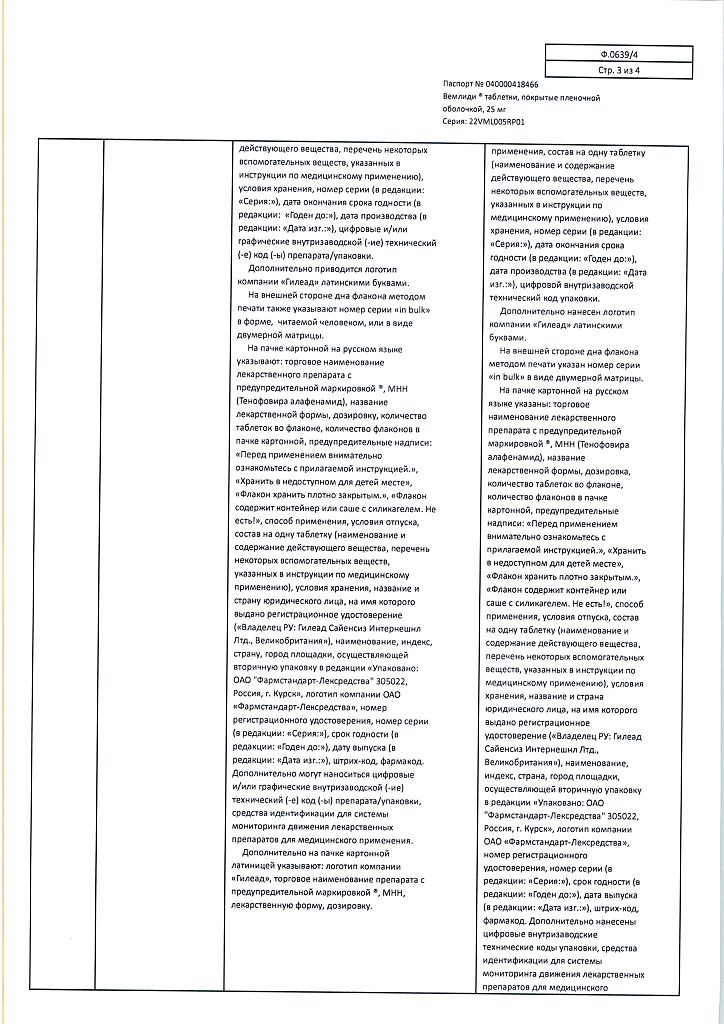 Противопоказано одновременное применение препарата Вемлиди® с лекарственными препаратами, содержащими тенофовира алафенамид, тенофовира дизопроксила фумарат или адефовира дипивоксил.