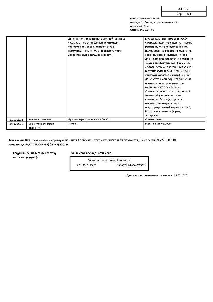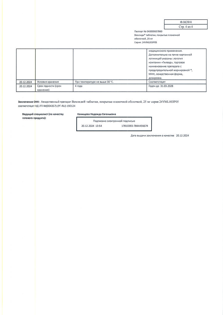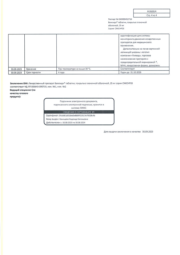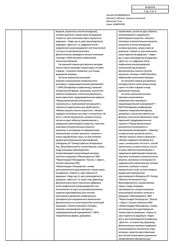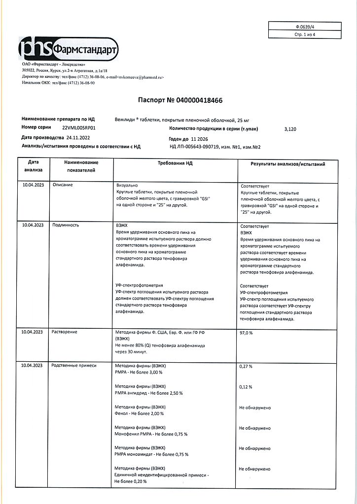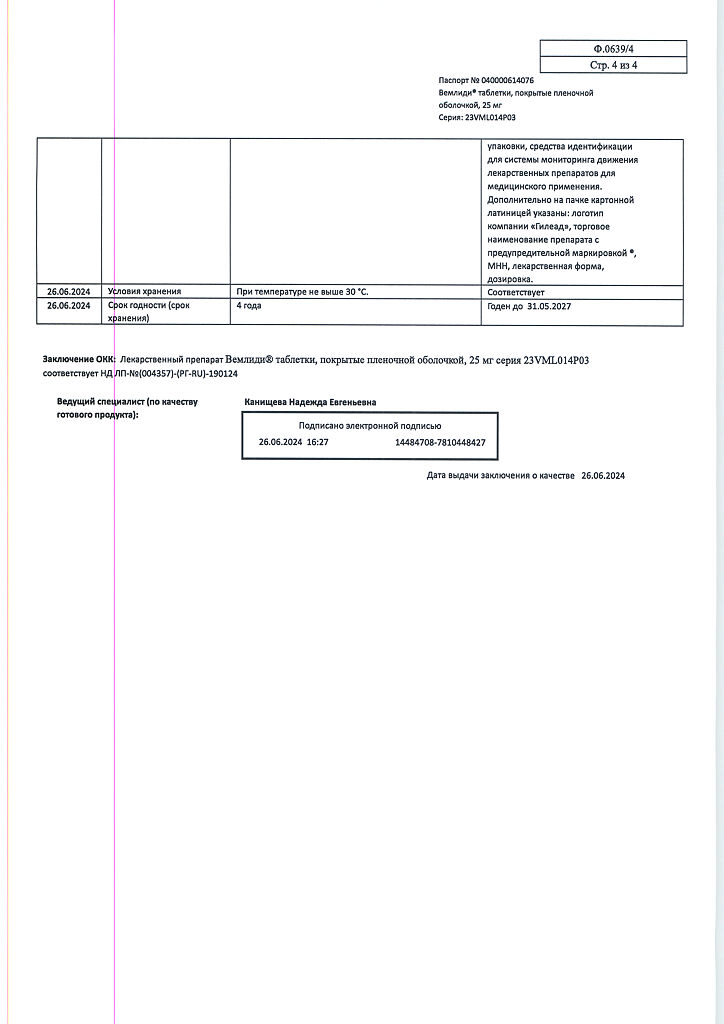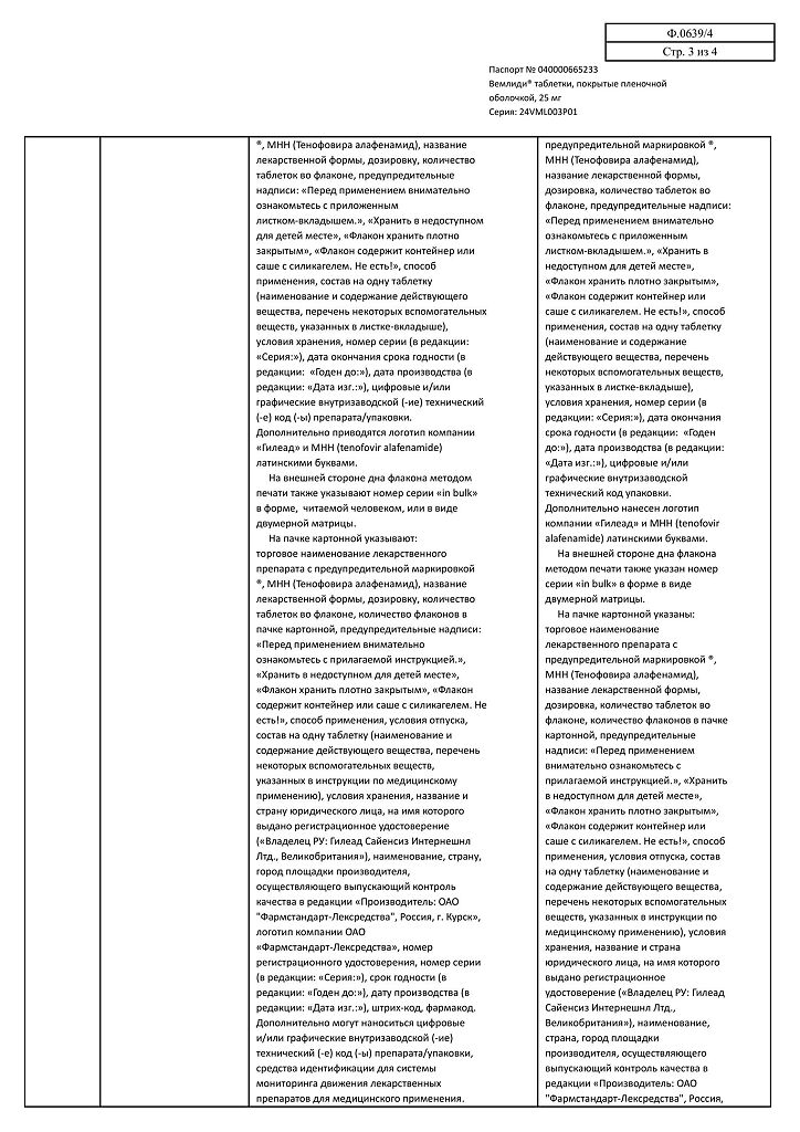 Рекомендации относительно применения препарата Вемлиди® один раз в сутки у пациентов с КК ≥ 15 мл/мин, но < 30 мл/мин, и у пациентов с КК < 15 мл/мин, находящихся на гемодиализе, основаны на весьма ограниченных фармакокинетических данных, а также на моделировании и симуляции. Данные по безопасности применения препарата Вемлиди® для лечения пациентов, инфицированных ВГВ, с КК < 30 мл/мин отсутствуют.
