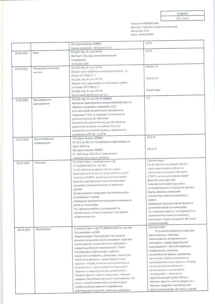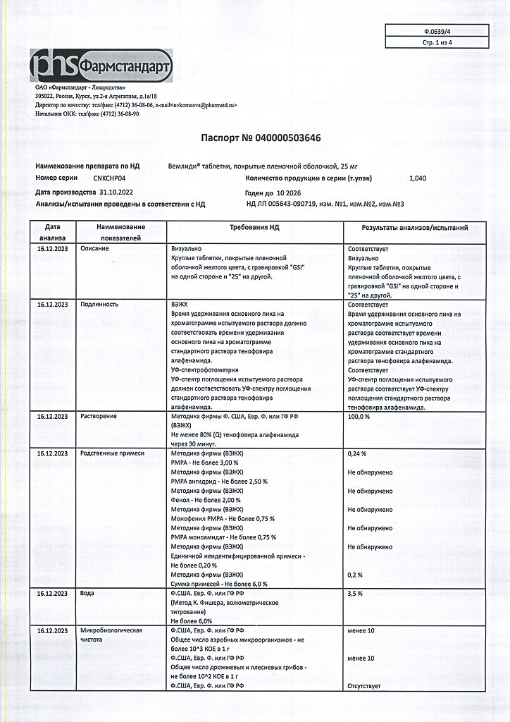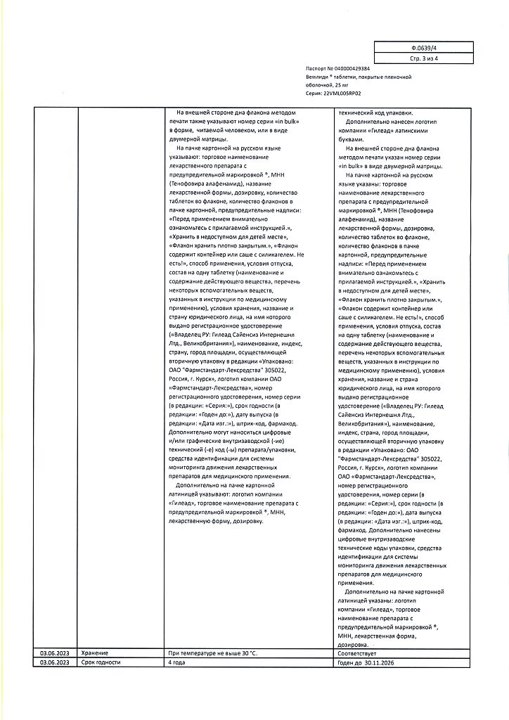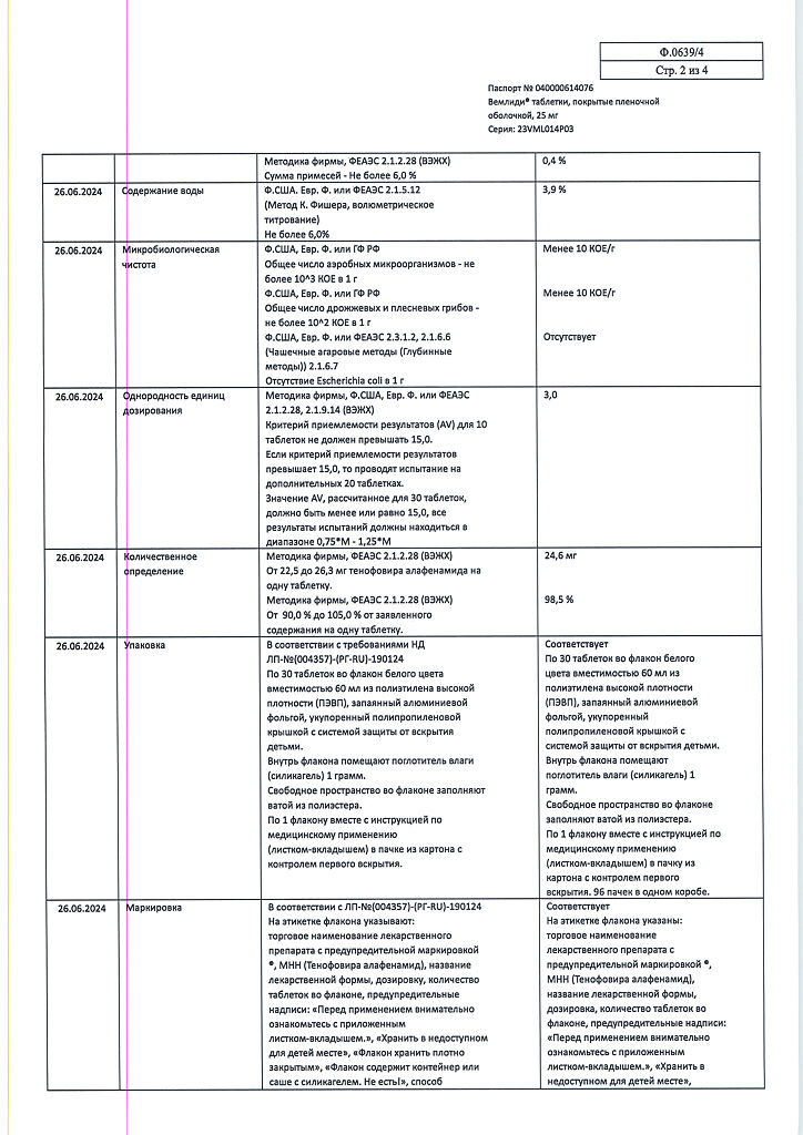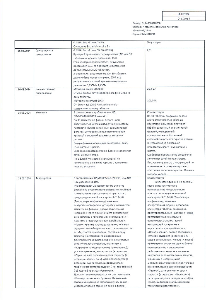 действующее вещество: тенофовира алафенамида фумарат 28,04 мг (в пересчете на тенофовира алафенамид 25 мг);