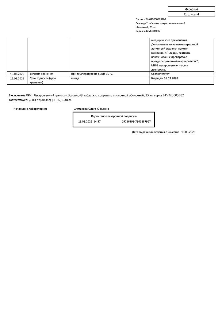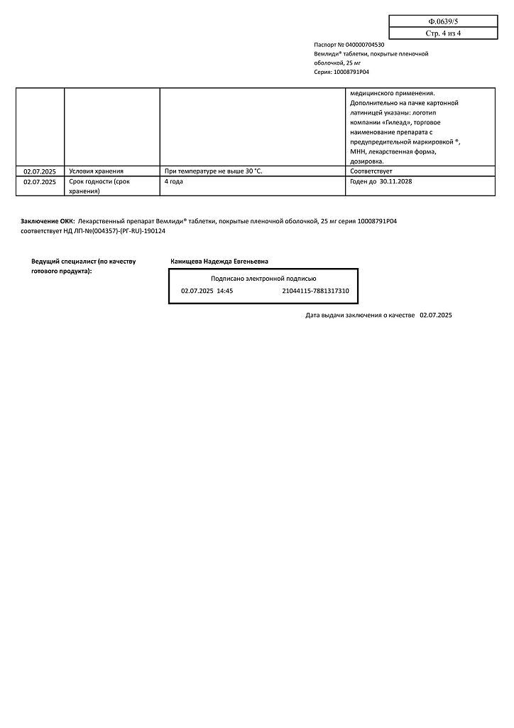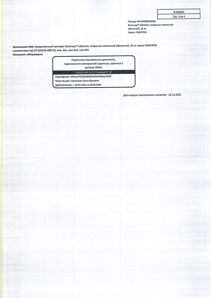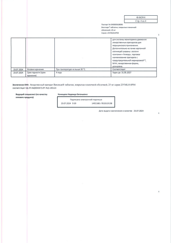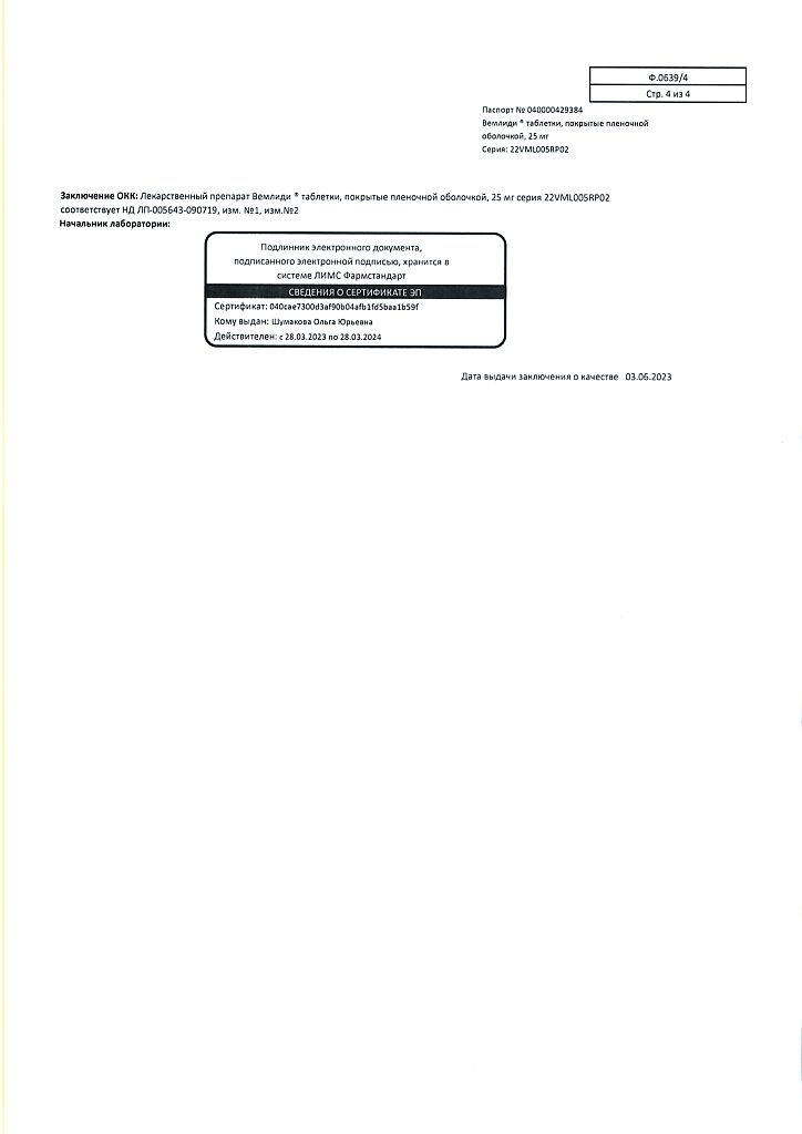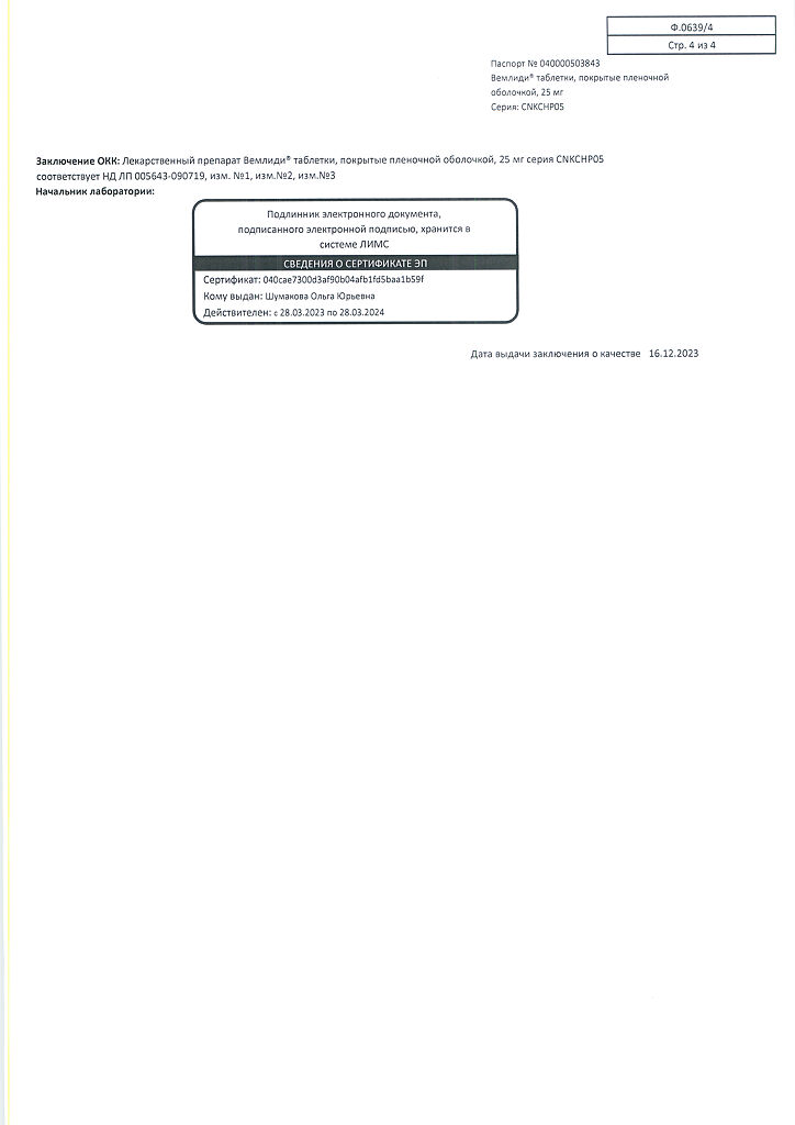 Для пациентов в возрасте 65 лет и старше коррекция дозы препарата Вемлиди® не требуется (см. раздел «Фармакокинетика»).