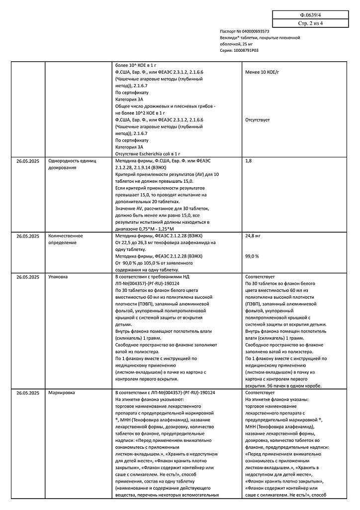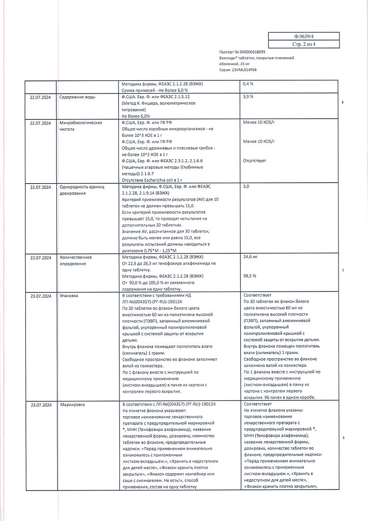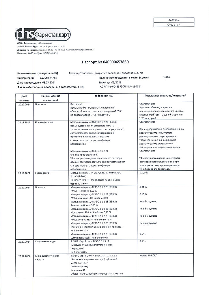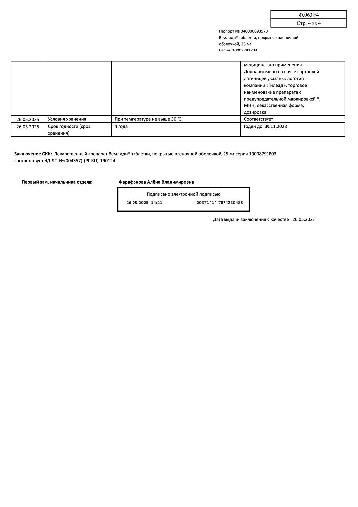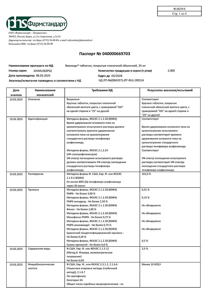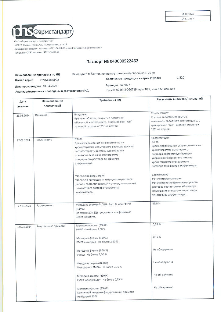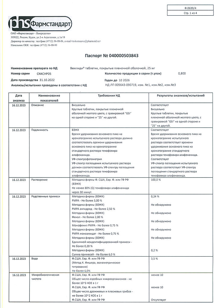 Данные о влиянии препарата Вемлиди® на фертильность человека отсутствуют. Исследования на животных не показали неблагоприятного воздействия тенофовира алафенамида на фертильность.